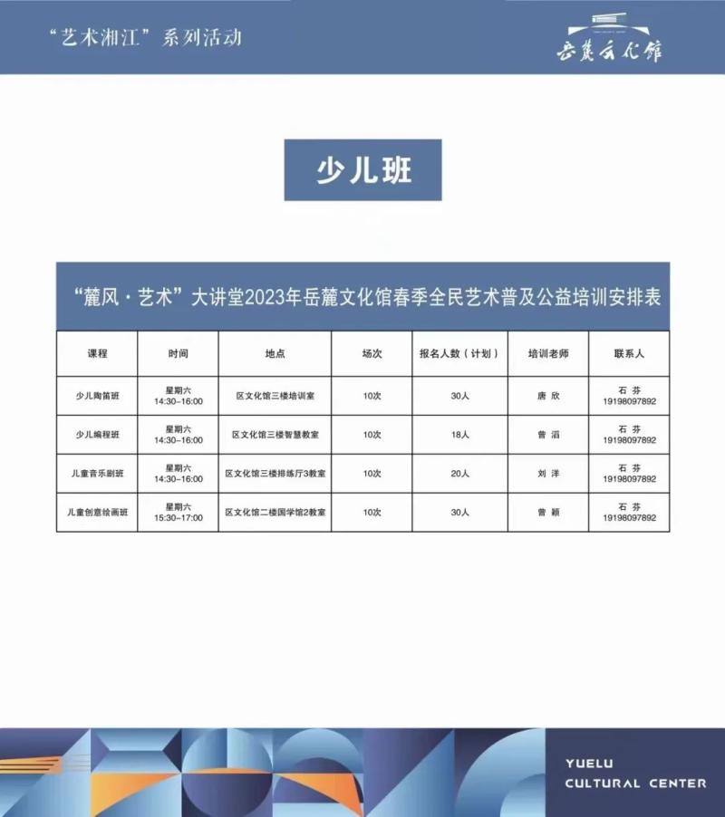 市民朋友们期待已久的“艺术湘江”系列活动“麓风·艺术”大讲堂2023年岳麓文化馆春季公益培训上线啦!岳麓文化馆诚意满满,既延续往年全民艺术普及公益培训,更创新性地打造多期文化艺术素养公益培训——与湖南美术馆、梅溪湖国际文化艺术中心大剧院、谢子龙影像艺术馆等新区文艺瑰地联动,与绚丽文艺精品亲密接触。文化艺术素养公益培训每期课程具体内容将在“长沙市岳麓区文化馆”微信公众号上进行预告和线上报名,欢迎您密切关注!
