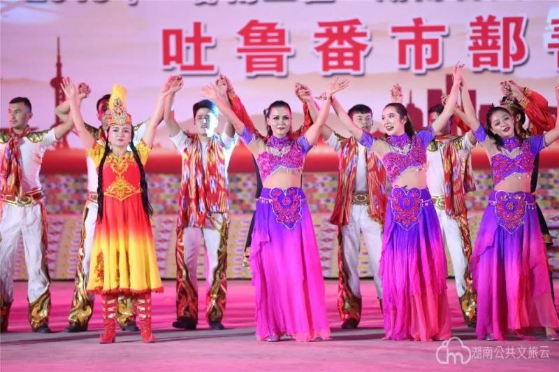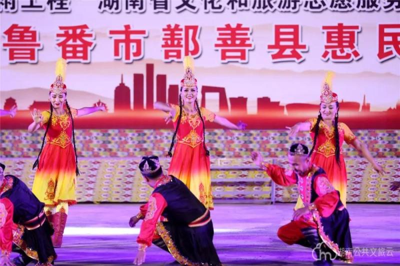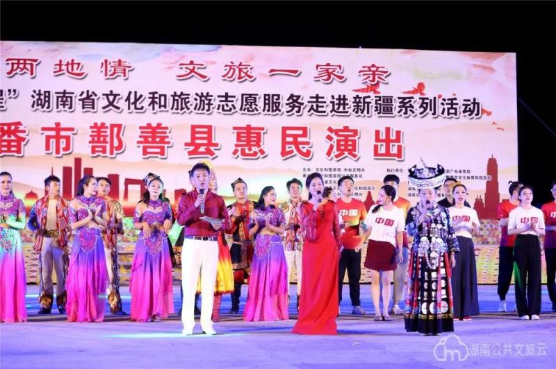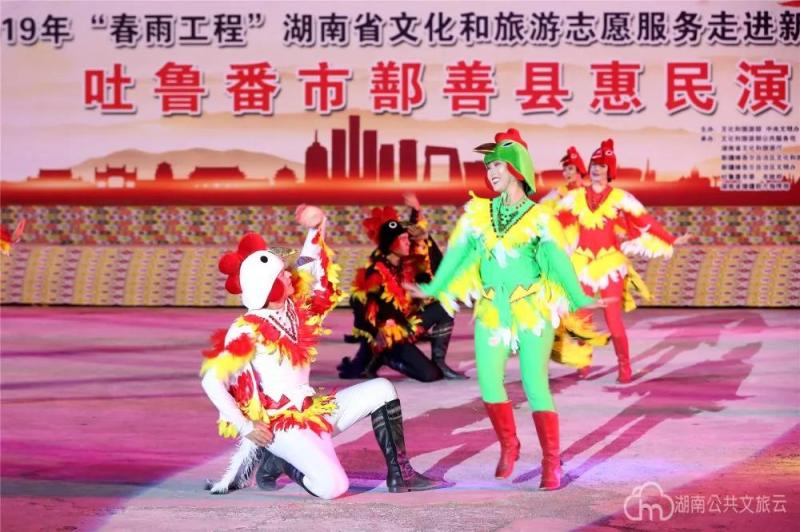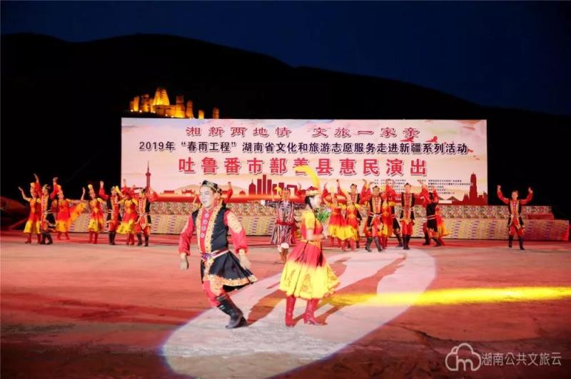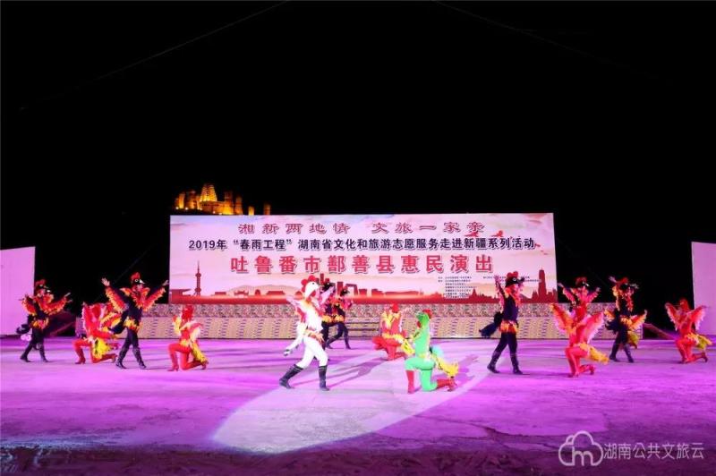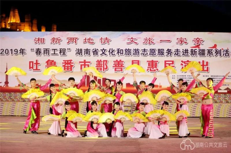 6月14日晚,2019“春雨工程”湖南省文化和旅游志愿服务鄯善县惠民演出在吐鲁番市鄯善县库木塔格沙漠景区举行。本次演出吸引了大量鄯善县当地居民和来自四面八方游客的观看,近距离感受湖湘文化的魅力。