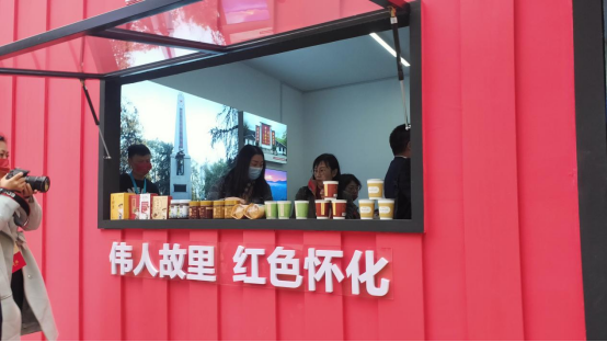 怀化市展区,位于展会的入口处,红色集装箱的外形设计,简洁明快。丰富多样的红色文旅产品,吸引了众多嘉宾和游客驻足观看,各类特色美食也引得参展人员纷纷停下脚步,品尝美味。