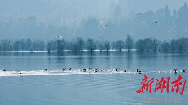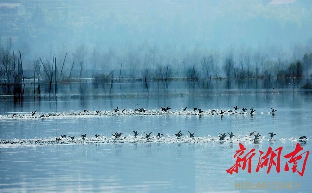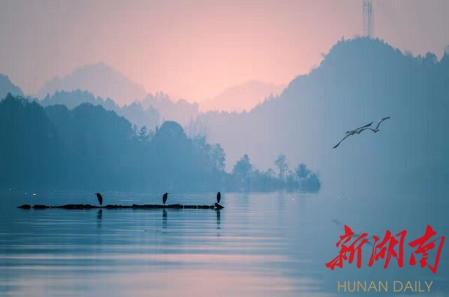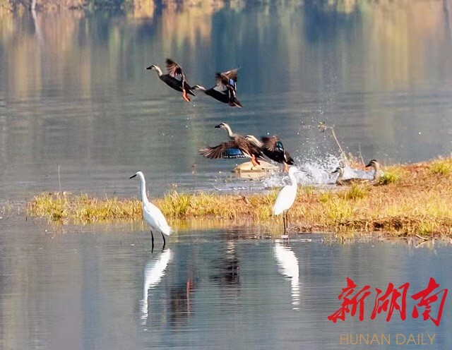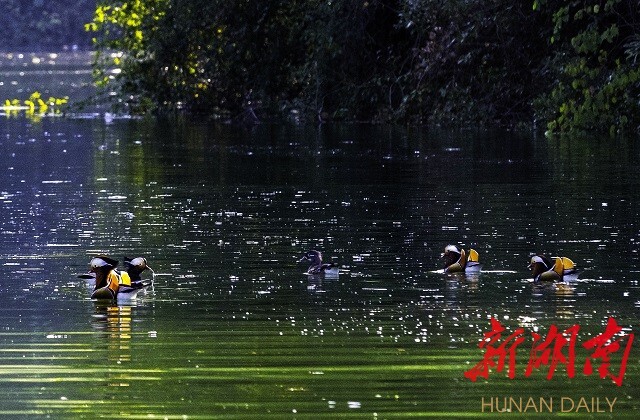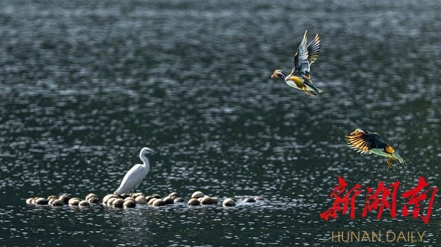 当前资江水量充沛、水质清洌,沿江两岸、江心小岛树影斑斓,与湛蓝的水面相映成趣,游船滑过江心,穿行于小岛之间,荡开层层涟漪,时不时惊起成群的鹈鹕在江面上表演“凌波微步”,成群的白鹭或“点缀”于树稍、或“列队”于浅岸、或“翩翔”于水天之间,时不时会有各种身影“陌生”的水鸟突然惊艳登场,点亮人们的视线,引来一片“惊呼”。在苏溪湖水域,几对野生鸳鸯时而与白鹭、苍鹭在浅岸觅食,时而追逐嬉戏、贴水飞行,时而两两依偎、互诉情话。色彩鲜艳的羽毛点缀着蓝色的湖面,一幅灵动的生态画卷美不胜收。
