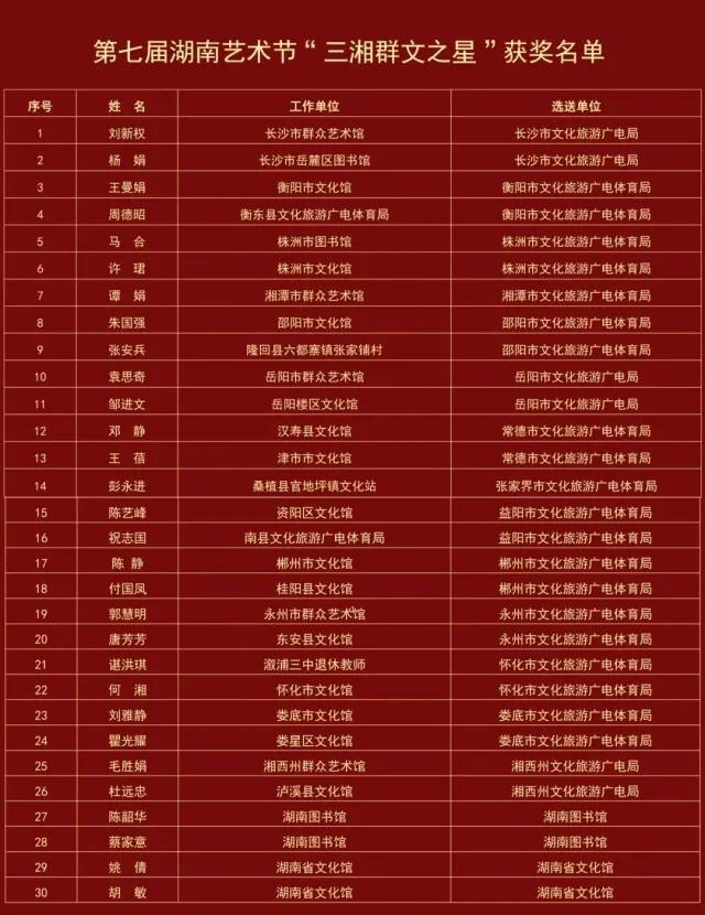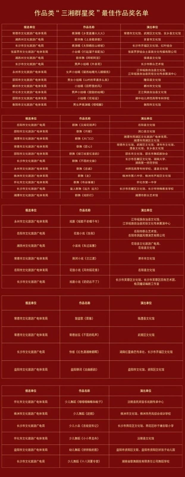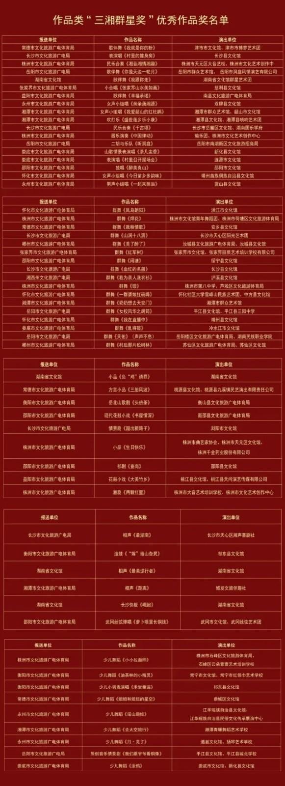 1月12日,第七届湖南艺术节在长沙闭幕,我省专业舞台艺术政府最高奖“田汉大奖”以及田汉新剧目奖、田汉小剧目奖、田汉单项奖、三湘群星奖、优秀摄影作品奖、齐白石艺术奖等一系列奖项同时揭晓。