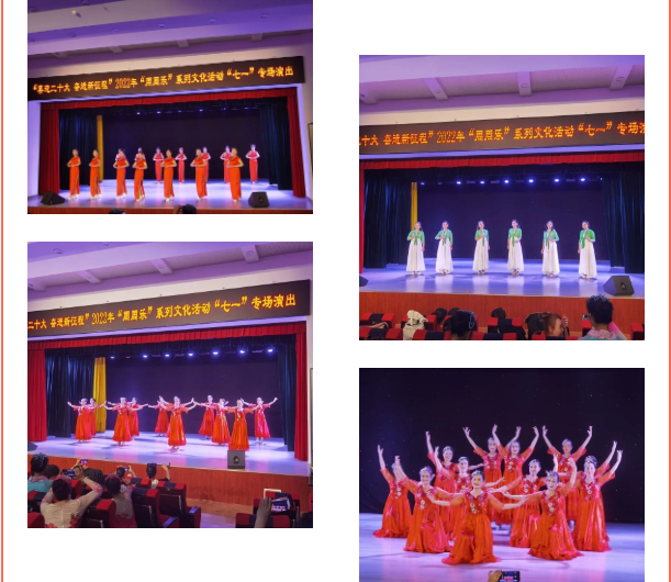 为隆重庆祝中国共产党成立101周年,喜迎党的二十大胜利召开,进一步营造浓厚的颂党、爱党、敬党的浓厚氛围,今日下午,我馆组织优秀群文团队在群星剧场举办“喜迎二十大·奋进新征程”2022年“周周乐”系列文化活动“七一”专场演出,大家欢聚一堂,载歌载舞。