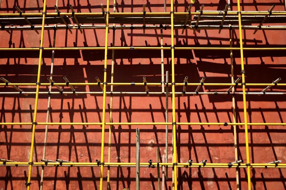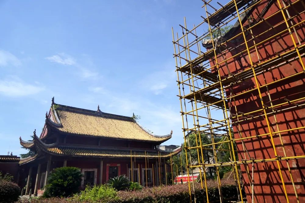 伴随阳光的照射,脚手架的影子倒映在文庙的红墙上,别有一番意味。相较于其它建筑施工、文庙的修缮有些不一样。脚手架没挨到外墙,保持了10公分左右的距离,这也是为了最大程度地保护古建墙体的完整性。
