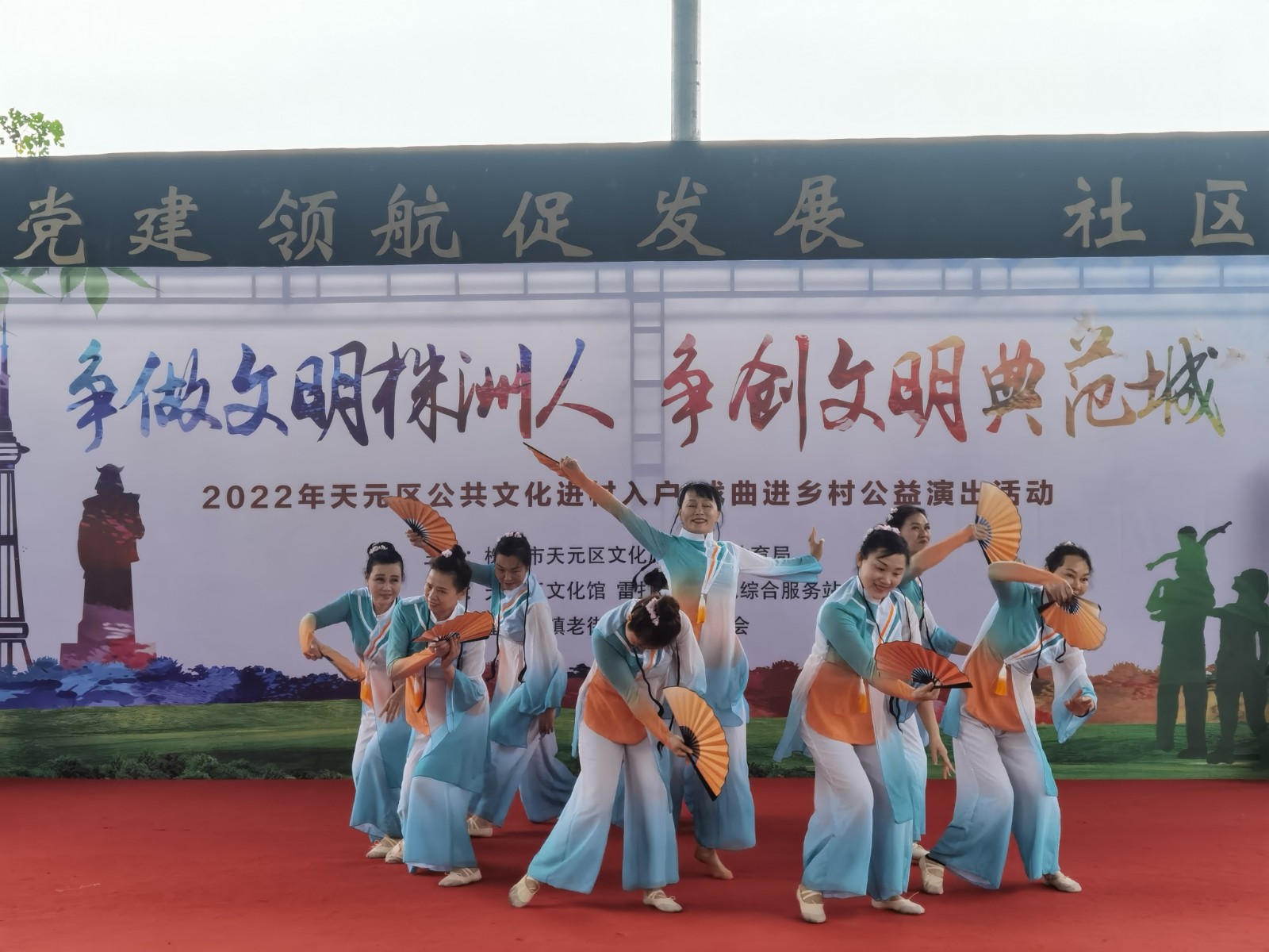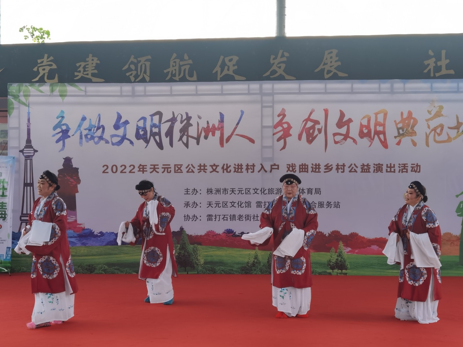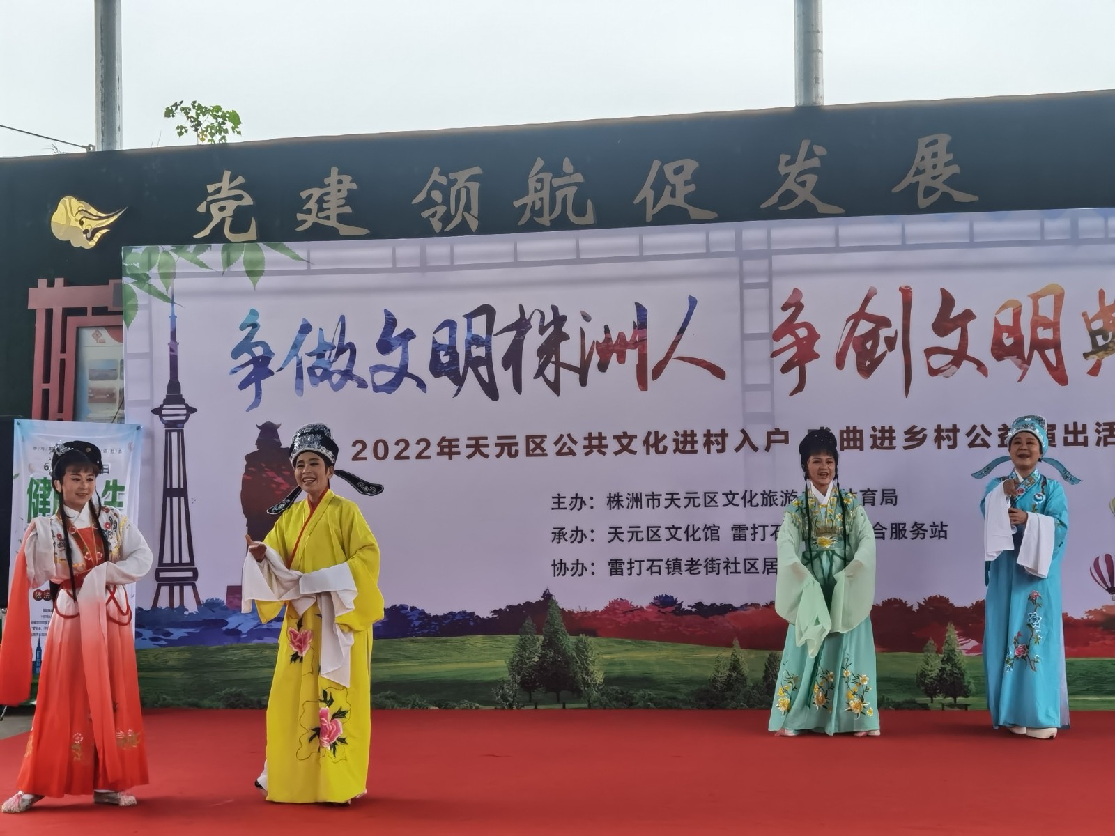 天元区文化旅游广电体育局、天元区文化馆于2022年4月29日开展“争做文明株洲人 争创文明典范城”2022年天元区公共文化进村入户 戏曲进乡村公益演出活动,演出地点在天元区雷打石镇老街社区,本次演出在天元区风景线艺术团的大型舞蹈《绽放的青春》拉开帷幕,整场演出活动包含舞蹈、快板、二胡、花鼓戏、小组唱等12个精彩节目!送戏曲乡进乡村还将定期持续开展,紧密围绕区委、区政府的中心工作为主题进行宣传,同时将文化馆创作的经典剧目与乡镇百姓自己表演的节目相结合,相互促进,互相交融,将“戏”真正送到街头巷尾、田间地头,打通了服务群众的“最后一公里”。将丰富的精神食粮送到百姓家门口,活跃基层群众的精神文化生活,切实增进广大群众的获得感和幸福感。