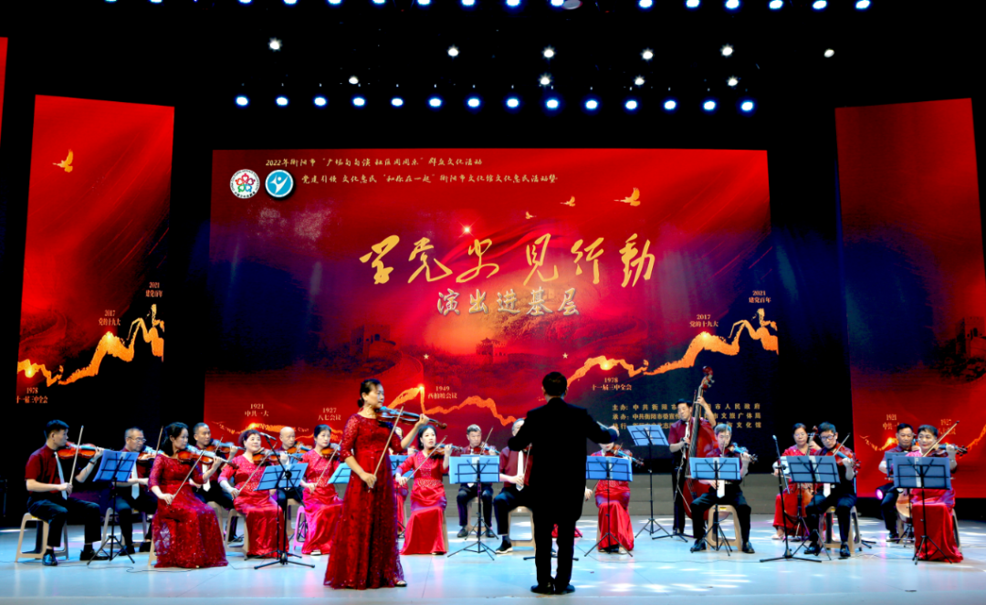 惠风和畅,群莺璀璨。7月21日,由衡阳市委、市政府主办,市委宣传部、市文旅广体局承办,市文化馆和市文旅志愿服务支队执行的2022年衡阳市“广场旬旬演 社区周周乐”群众文化活动暨党建引领 文化惠民“和你在一起”衡阳市文化馆文化惠民活动在市广电中心精彩上演。本次活动分为上午和下午两场,全面展示近年来衡阳市民间文艺团体群众文化活动蓬勃发展的新风貌和社会各界学党史、见行动,牢记初心使命、赓续红色血脉,坚定跟党走的信念,砥砺奋进的力量。衡阳市文旅广体局副局长罗志宏、市文旅广体局公共服务科科长廖亚楼、市文化馆班子成员等领导兴致勃勃地观看了演出。本次演出采用线上+线下联动方式进行,衡阳公共文化云对活动进行了现场录播,我市各地观众通过线上网络平台观看二场精彩演出,据统计,当晚共有2万多人次观看,满足了群众足不出户就能观看文艺演出的需求。