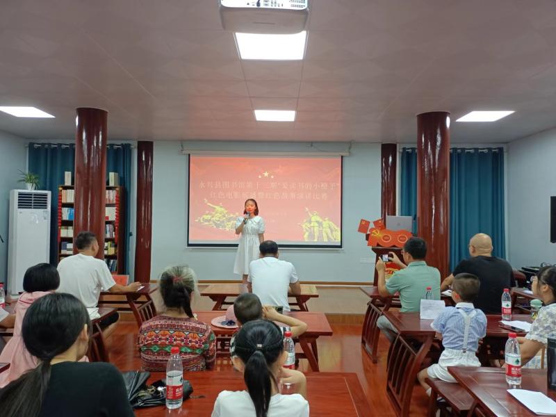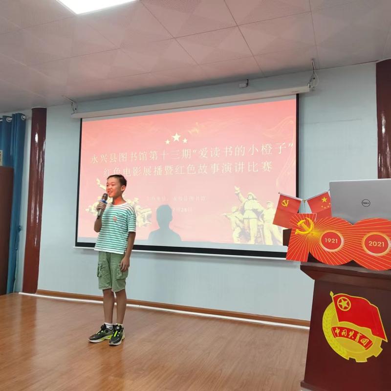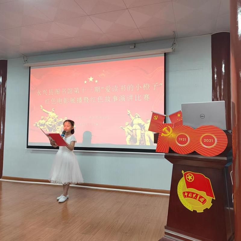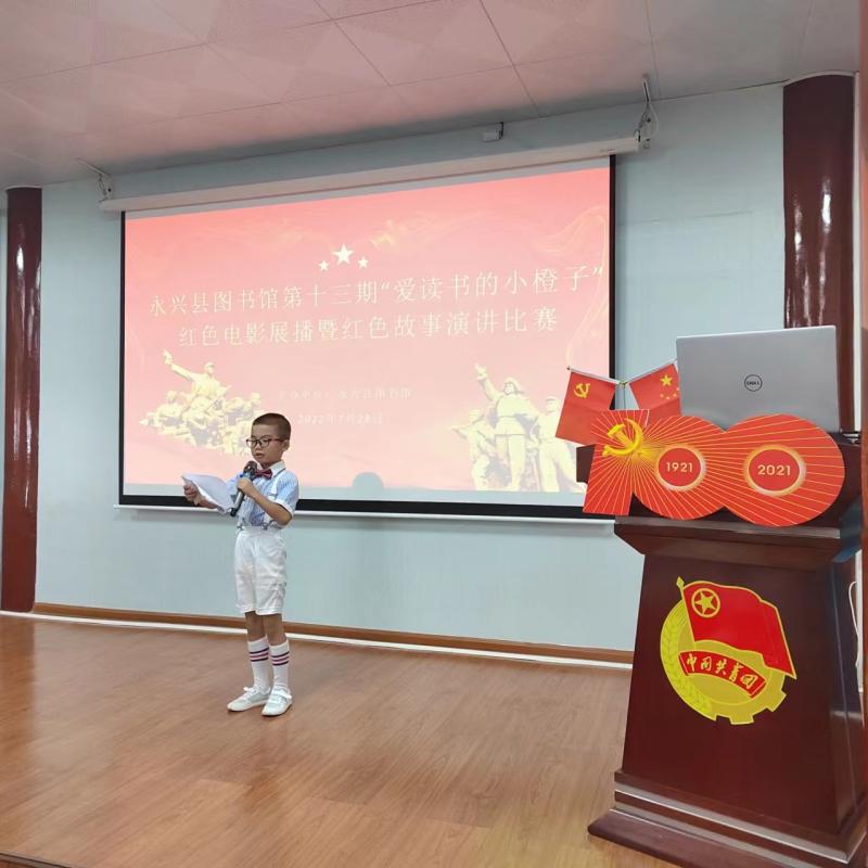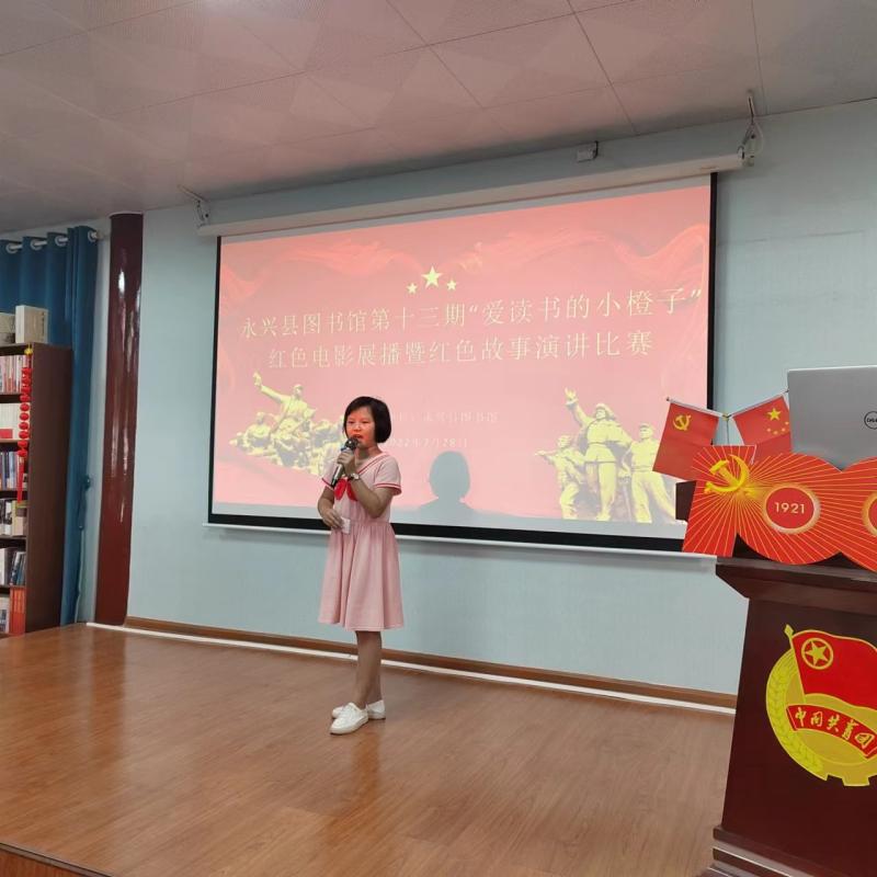 2022年7月29日上午,为增强学生对党、对祖国的深厚感情,激励学生坚定爱国信念,树立远大理想,让学生重温党的光辉历史,缅怀先烈的丰功伟绩,永兴县图书馆开展了第十三期“爱读书的小橙子”红色电影展播暨红色故事演讲比赛活动。