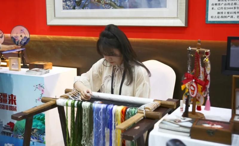 7月31日,2022“新疆是个好地方”对口援疆19省市非物质文化遗产展在新疆美术馆启幕。湖南省文化和旅游厅精选湘绣、黑茶(茯砖茶)制作技艺、醴陵釉下五彩瓷烧制技艺、挑花(花瑶挑花)等9个非遗代表性项目、500余件展品参展。其中郴州银饰锻制技艺、滩头木版年画两个项目通过线上连接展厅参展。