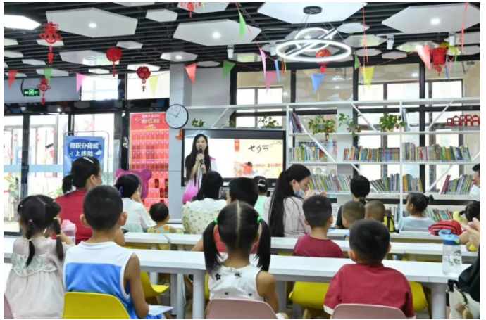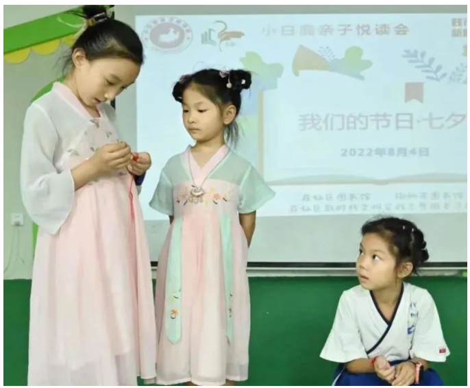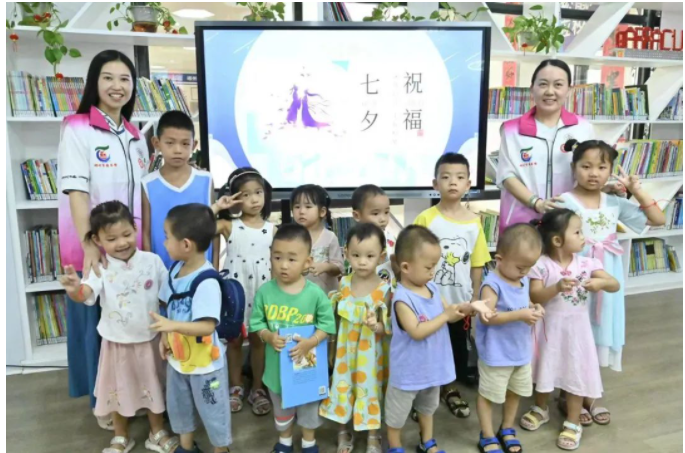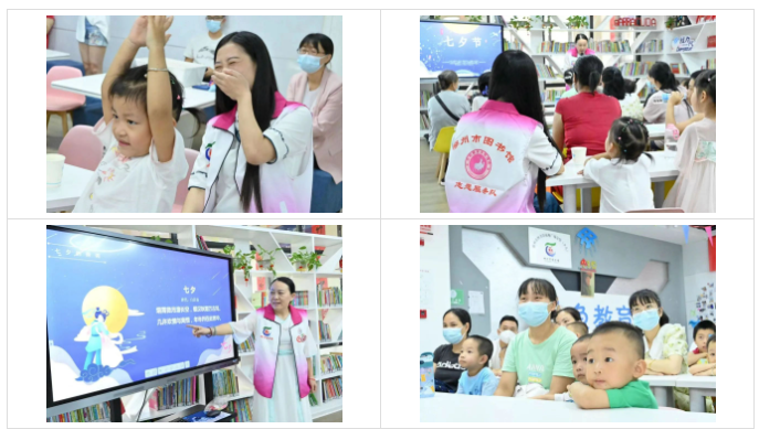 2022年8月4日,郴州市图书馆、苏仙区图书馆、郴州市图书馆福地广场分馆开展“我们的节日·七夕”三馆同庆活动。本期活动选取了中国传统文化节日七夕的特色元素,以《牛郎织女的故事》绘本讲解为主线,中间穿插七夕节诗词与谚语赏析解读、乞巧手工创作等环节,全方位刻画节日形象。三馆共计90组亲子家庭参与。