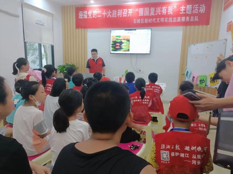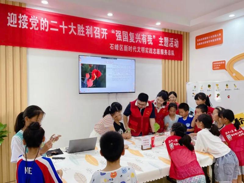 为深入学习贯彻习近平新时代中国特色社会主义思想,喜迎党的二十大胜利召开,充分发挥党的创新理论在示范引领、滋养人心、凝聚力量等方面的积极作用,同时培养儿童青少年爱党爱国情怀,丰富儿童青少年暑期文化生活,让孩子们度过一段快乐、难忘且有意义的假期,石峰区新时代文明实践志愿服务总队携手石峰区妇联、石峰区图书馆特开展青春护航·相约石峰——“微宣讲+暑期文明实践课堂”系列活动。