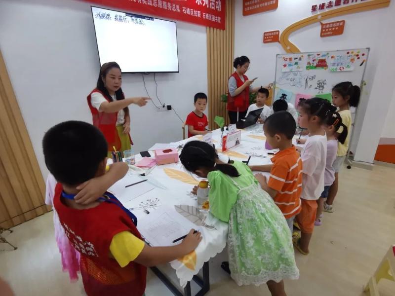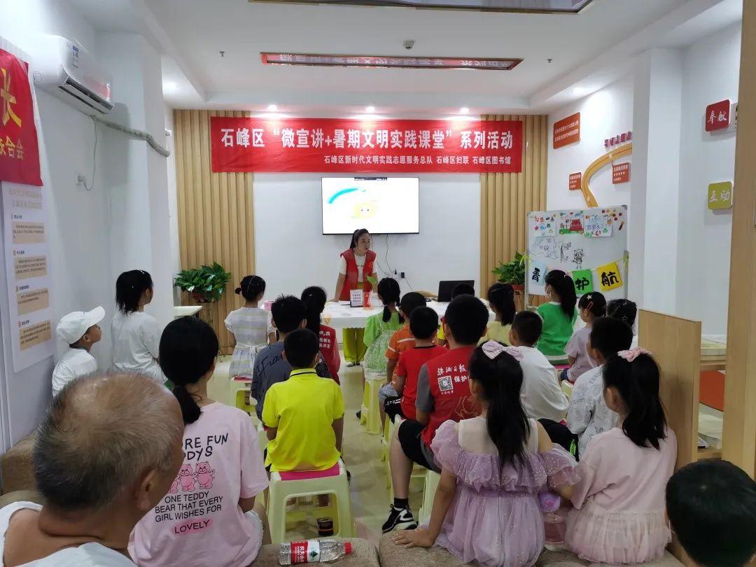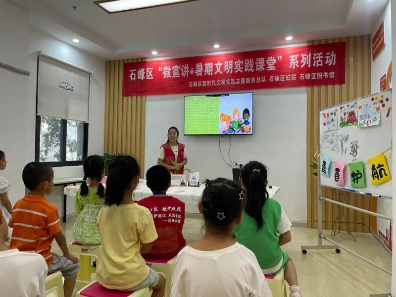 为深入学习贯彻习近平新时代中国特色社会主义思想,喜迎党的二十大胜利召开,充分发挥党的创新理论在示范引领、滋养人心、凝聚力量等方面的积极作用,同时培养儿童青少年爱党爱国情怀,丰富儿童青少年暑期文化生活,让孩子们度过一段快乐、难忘且有意义的假期,石峰区新时代文明实践志愿服务总队携手石峰区妇联、石峰区图书馆特开展青春护航·相约石峰——“微宣讲+暑期文明实践课堂”系列活动。