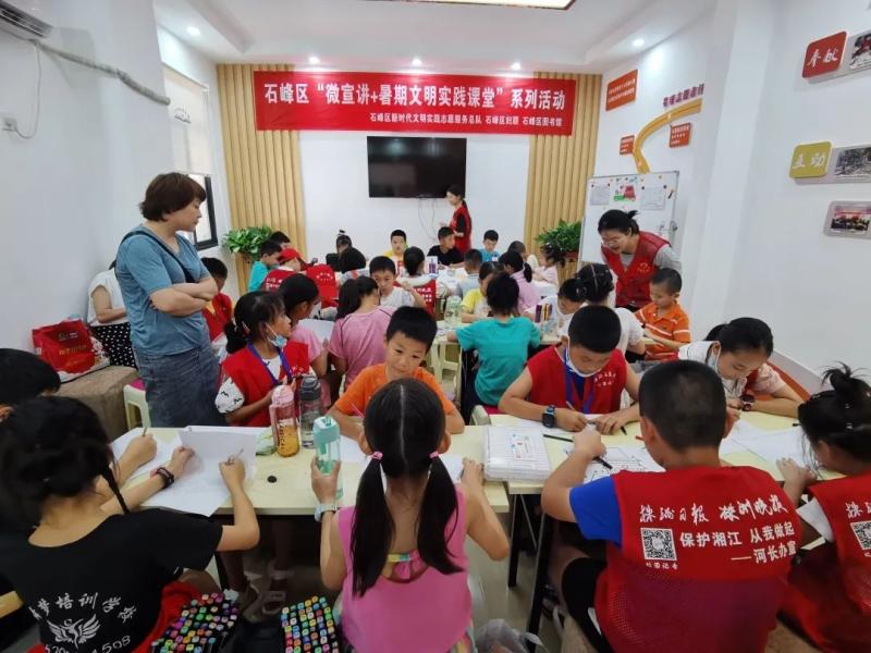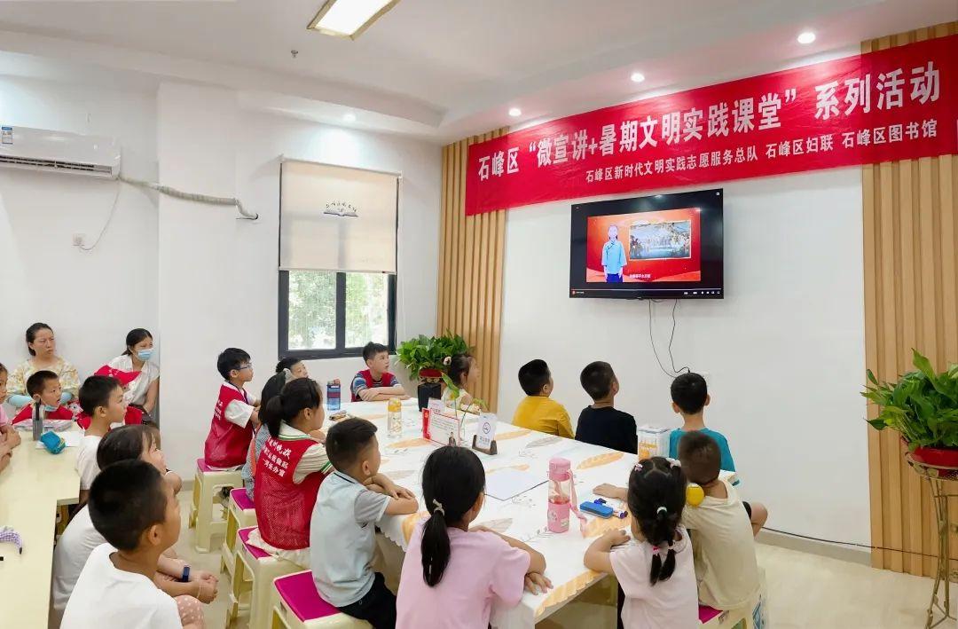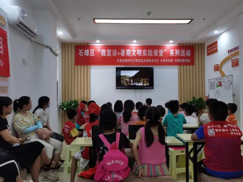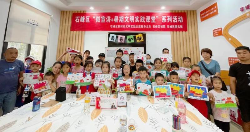 为深入学习贯彻习近平新时代中国特色社会主义思想,喜迎党的二十大胜利召开,充分发挥党的创新理论在示范引领、滋养人心、凝聚力量等方面的积极作用,同时培养儿童青少年爱党爱国情怀,丰富儿童青少年暑期文化生活,让孩子们度过一段快乐、难忘且有意义的假期,石峰区新时代文明实践志愿服务总队携手石峰区妇联、石峰区图书馆特开展青春护航·相约石峰——“微宣讲+暑期文明实践课堂”系列活动。