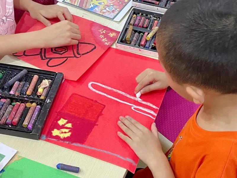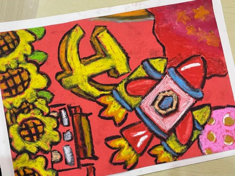 课堂上老师积极鼓励孩子们展开想象,通过手中的画笔描绘祖国繁荣昌盛的美好景象,表达对党和国家最纯真的情感和最真挚的祝福。从党徽国旗到最新一代的火箭,让爱国的种子在孩子们幼小的心灵中萌发。