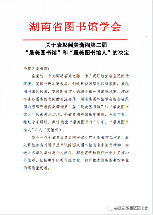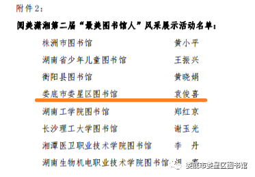 由湖南省图书馆学会在全省范围内组织开展阅美潇湘第二届“最美图书馆”和“最美图书馆人”风采展示活动中,共评选出“最美图书馆”5家,“最美图书馆人”8 人。娄星区图书馆袁俊喜榜上有名,荣膺“最美图书馆人”光荣称号。