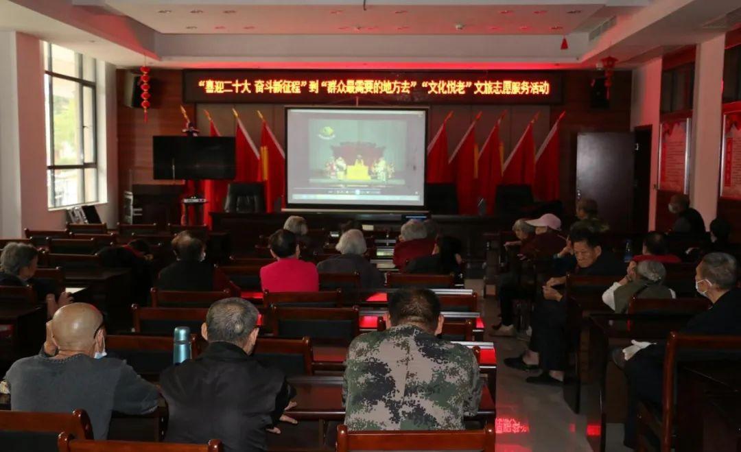 文旅志愿者播放了名家京剧荟萃《穆桂英挂帅》,老人们一个个目不转睛,看得有滋有味,有的老同志还跟着视频哼唱起来,近90分钟的视频观赏完后,志愿者还陪大家拉起了家常。