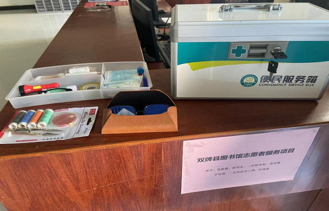 为进一步保障特殊群体的基本文化权益,让其享受更加完善的公共文化服务,共享物质文明与精神文明建设成果,图书馆作为本县公共文化服务重要窗口之一,建立有盲文室和无障碍通道;在外借区服务台上,配备了专门的便民服务箱,内有老花镜、针线盒、创可贴等设备。