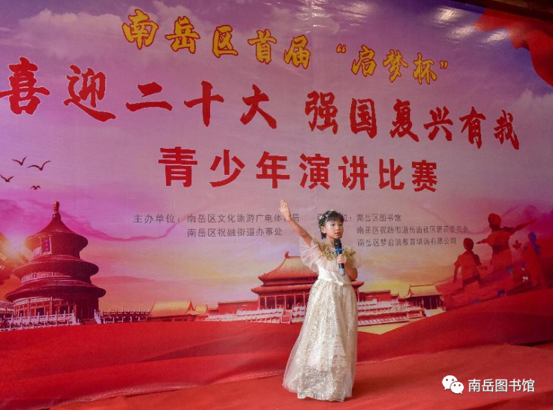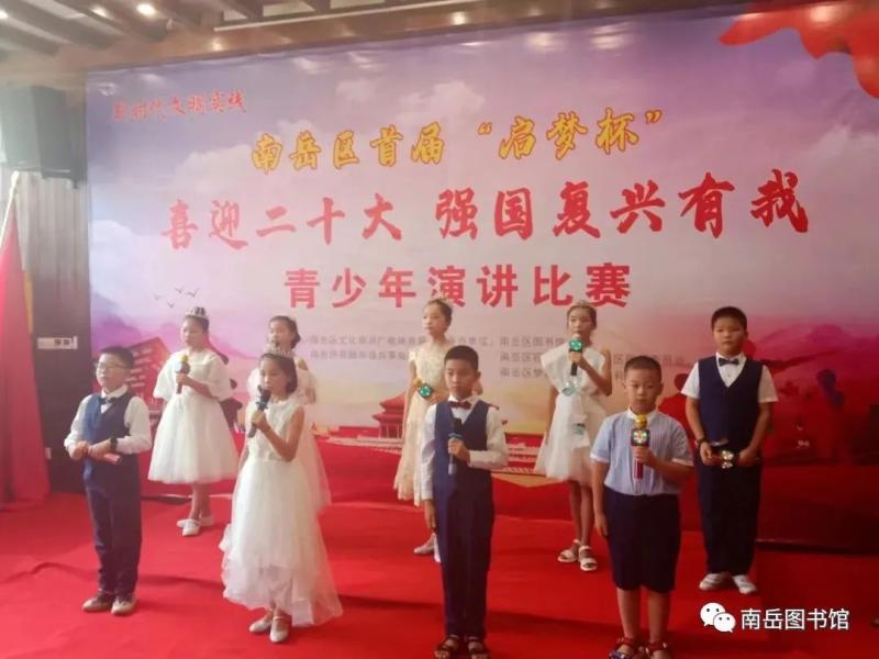 “强国复兴有我”主题活动是为了“喜迎二十大”,弘扬传承红色文化,增强全区少年儿童对红色文化的了解,培养全区居民、少年儿童爱国爱家情怀,大力唱响爱党爱国时代主旋律而举办的。活动自6月份启动以来,南岳图书馆开展了“红色经典” 主题阅读分享会、“传承红色记忆”微故事征集、“踏寻红色足迹 ”少儿研学等主题活动,吸引了全区400多名青少年踊跃参与。此次演讲活动也是采用线上线下相结合的方式,经过2个多月的选拔、网上优秀音频展播,最终确定27个作品进入比赛。