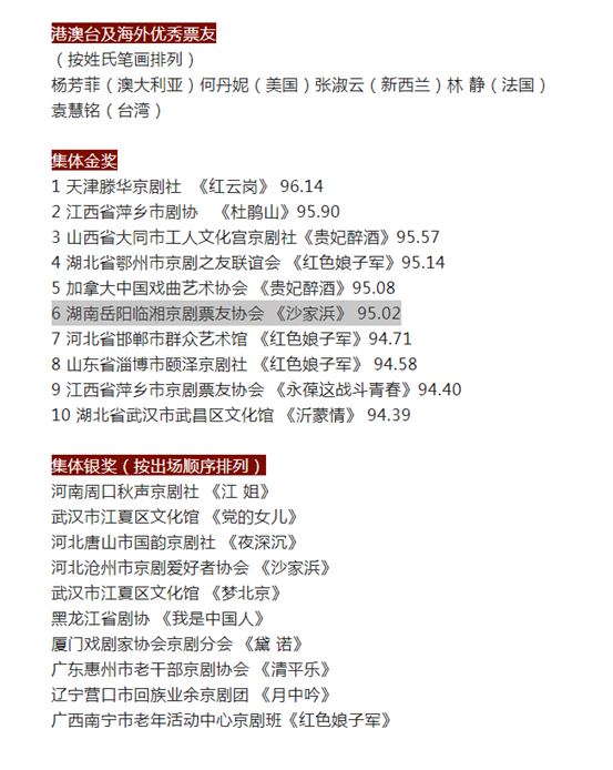 9月23日,第十六届“和平杯”京剧票友邀请赛决赛结束,由临湘市文化馆、临湘市京剧票友协会选送的京剧《沙家浜》以 95.02高分获集体金奖。