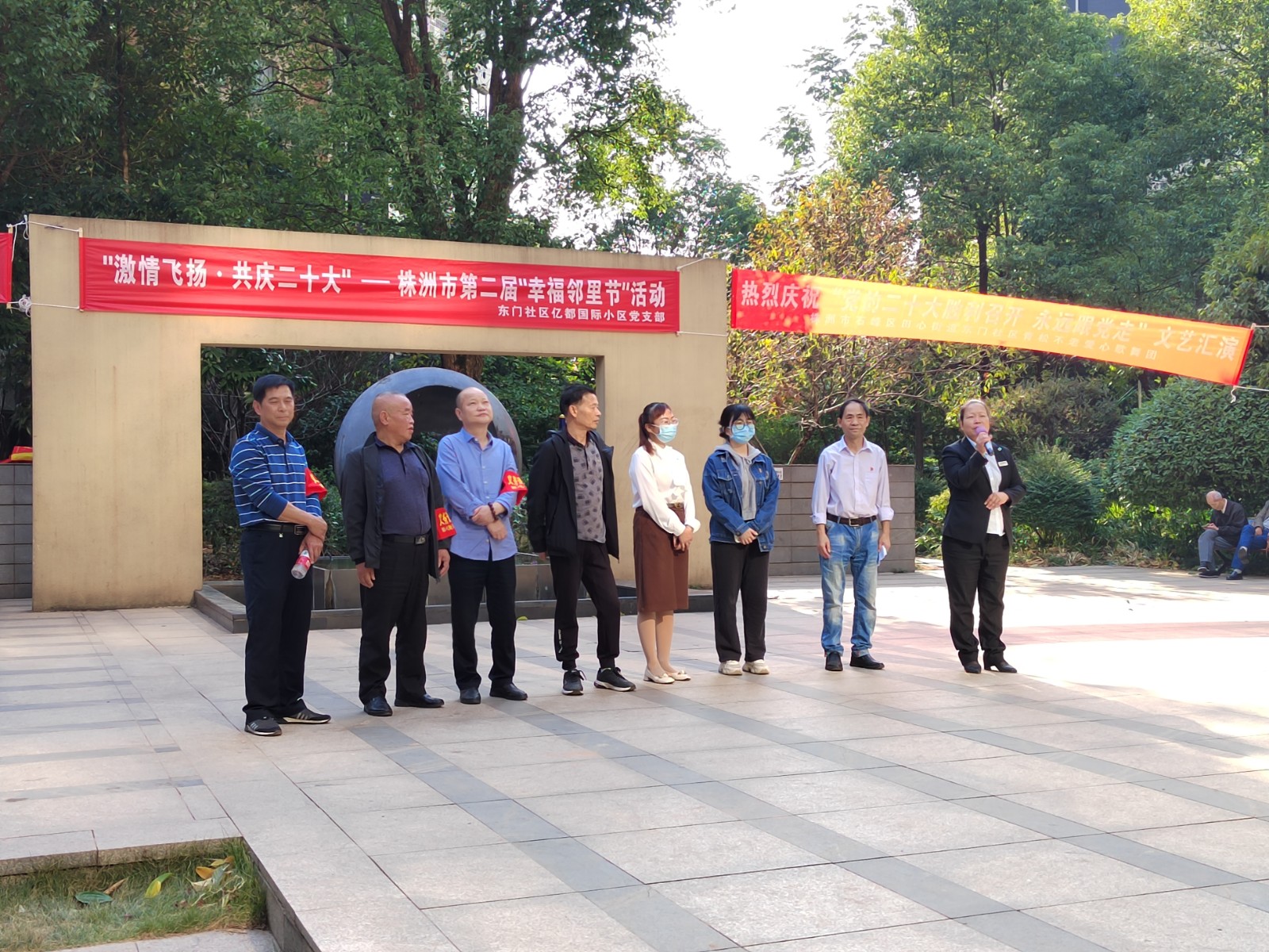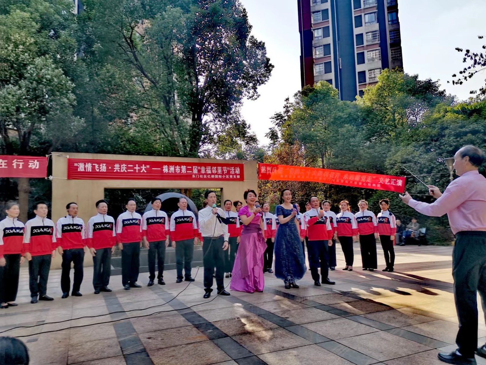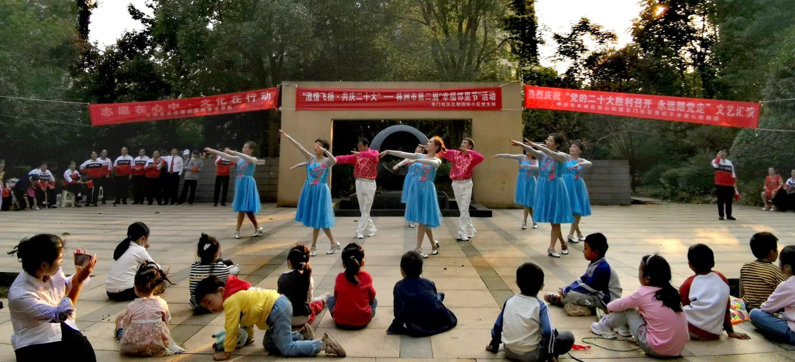 为庆祝党二十大隆重开幕, 10月16日,石峰区文化馆志愿服务分队青松不老歌舞团文化志愿者,在田心东门社区亿都国际小区开展“志愿在心中 文化在行动”—“激情飞扬 共庆二十大”文艺汇演志愿服务活动。