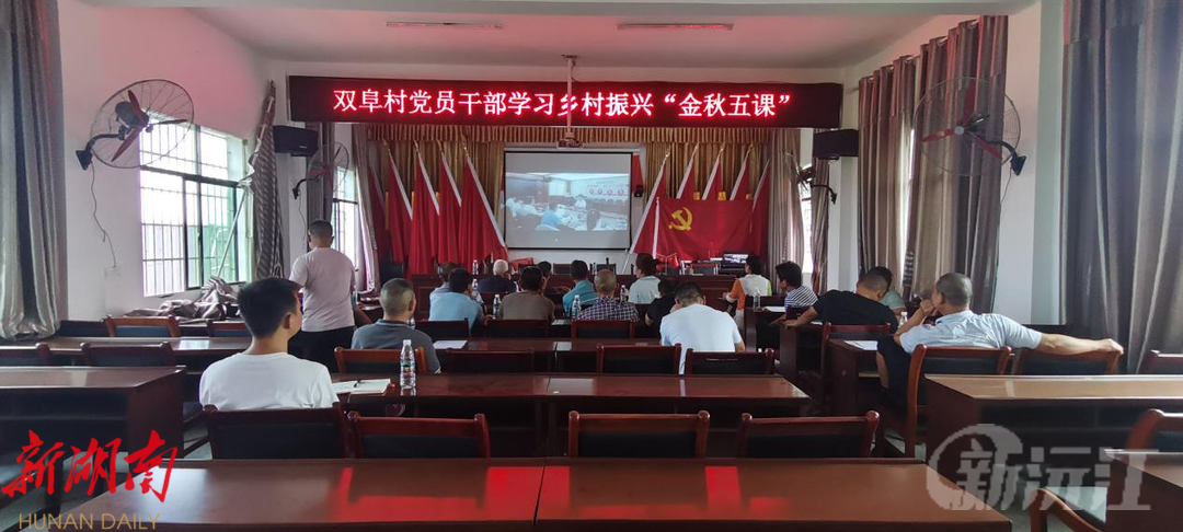 (通讯员 梁爽 刘渊源)9月9日8时30分,沅江市共华镇双阜村村民服务中心会议室内人头攒动,村干部、党员群众、驻村干部早已守候在大屏幕前,集中收看“金秋五课”。