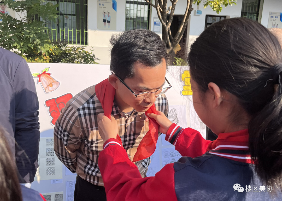 学生代表为出席此次活动的各位领导和来宾戴上红领巾