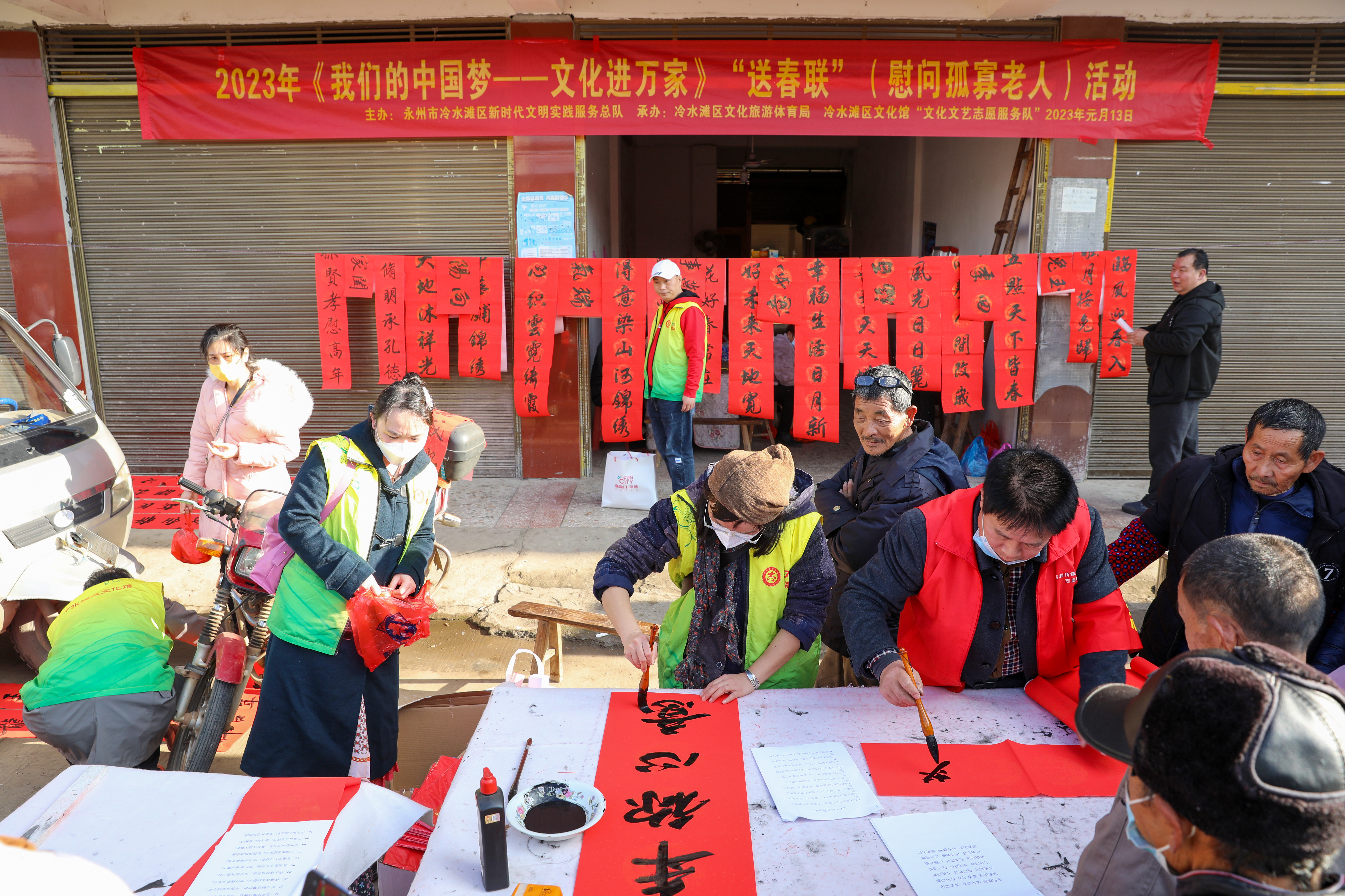 1月13日上午,正值冷水滩普利桥镇赶大集的日子。由永州市冷水滩区新时代文明实践志愿服务总队主办,普利桥镇政府、冷水滩区文化旅游体育局及冷水滩区文化馆承办的“我们的中国梦—文化进万家”慰问孤寡老人主题活动在普利桥镇农贸市场内举行。