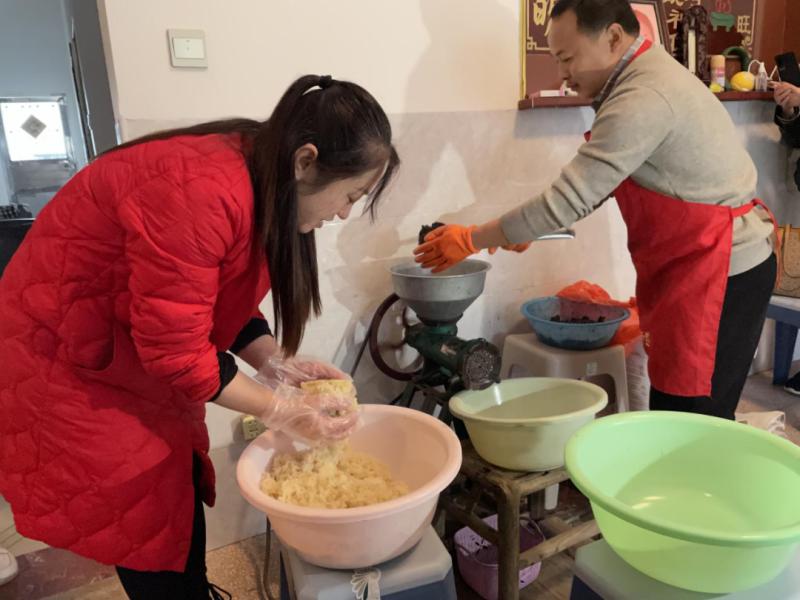 为现场群众普及双牌县非遗项目的基本情况,同时向当地群众咨询了本地风俗习惯、美食及古老传说,为挖掘新的非遗项目做准备。随后进行了手工糍粑制作,并在非遗年夜饭活动中品尝了双牌县市级非遗牙山羊肉及县级非遗双牌酒糟肉。