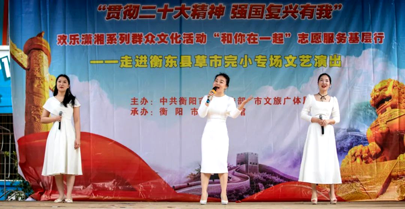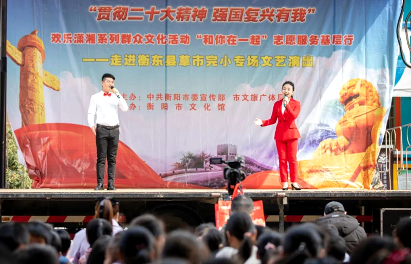 春光明媚,山花烂漫。2023年2月28日上午,衡东县草市镇草市完小内载歌载舞,一片欢声笑语。“贯彻二十大精神,强国复兴有我”欢乐潇湘系列群众文化活动“和你在一起”志愿服务基层行——走进衡东县草市完小演出活动在这里精彩上演。市公共文旅服务科科长廖亚楼、市文化馆领导班子、草市完小负责人等与现场近600名师生兴致勃勃地观看了演出。此次活动由衡阳公共文化云进行网络直播,活动吸引市民的广泛关注和点赞,深受百姓的喜爱。