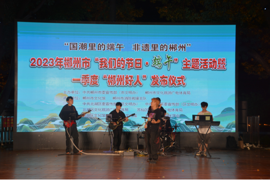 6月20日晚,“国潮里的端午·非遗里的郴州”2023年郴州市“我们的节日·端午”主题活动在北湖公园水月洲激情上演。本次活动由中共郴州市委宣传部、郴州市文旅广体局主办,由郴州市文化馆、郴州市消防救援支队、北湖区新时代文明实践中心、苏仙区委宣传部、北湖区文旅广体局、苏仙区文旅广体局共同承办,由北湖区文化馆、苏仙区文化馆、郴州市群众文化学会联合协办。