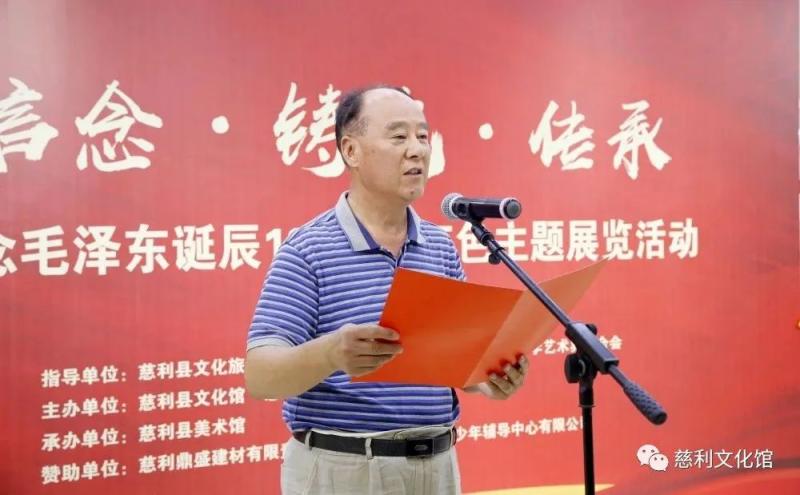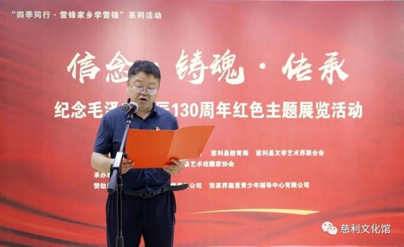 为深入学习贯彻党的二十大精神,继承发扬毛泽东等老一辈革命家的革命精神和崇高风范,传承红色基因,值此中国共产党建党102周年之际,由慈利县文化馆、慈利县艺术收藏家协会主办,慈利县美术馆承办的“四季同行·雷锋家乡学雷锋”系列活动“信念·铸魂·传承”——纪念毛泽东诞辰130周年红色主题展开幕式于6月30日上午10:00在慈利县美术馆隆重举行,本次展览得到了慈利县文化旅游广电体育局、慈利县教育局、慈利县文学艺术界联合会的倾力指导与支持。