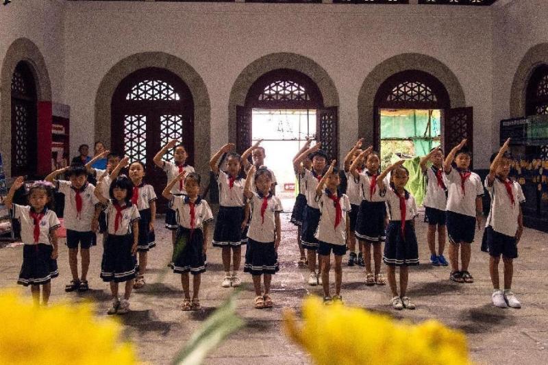 最后, 在忠烈祠纪念堂,学生们站成一列纵队,依次献花, 向先烈行少先队队礼。