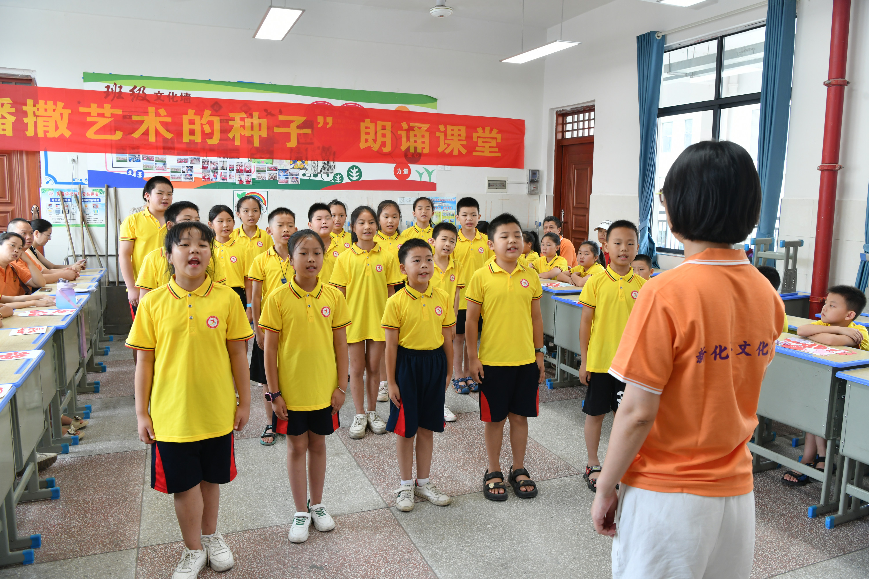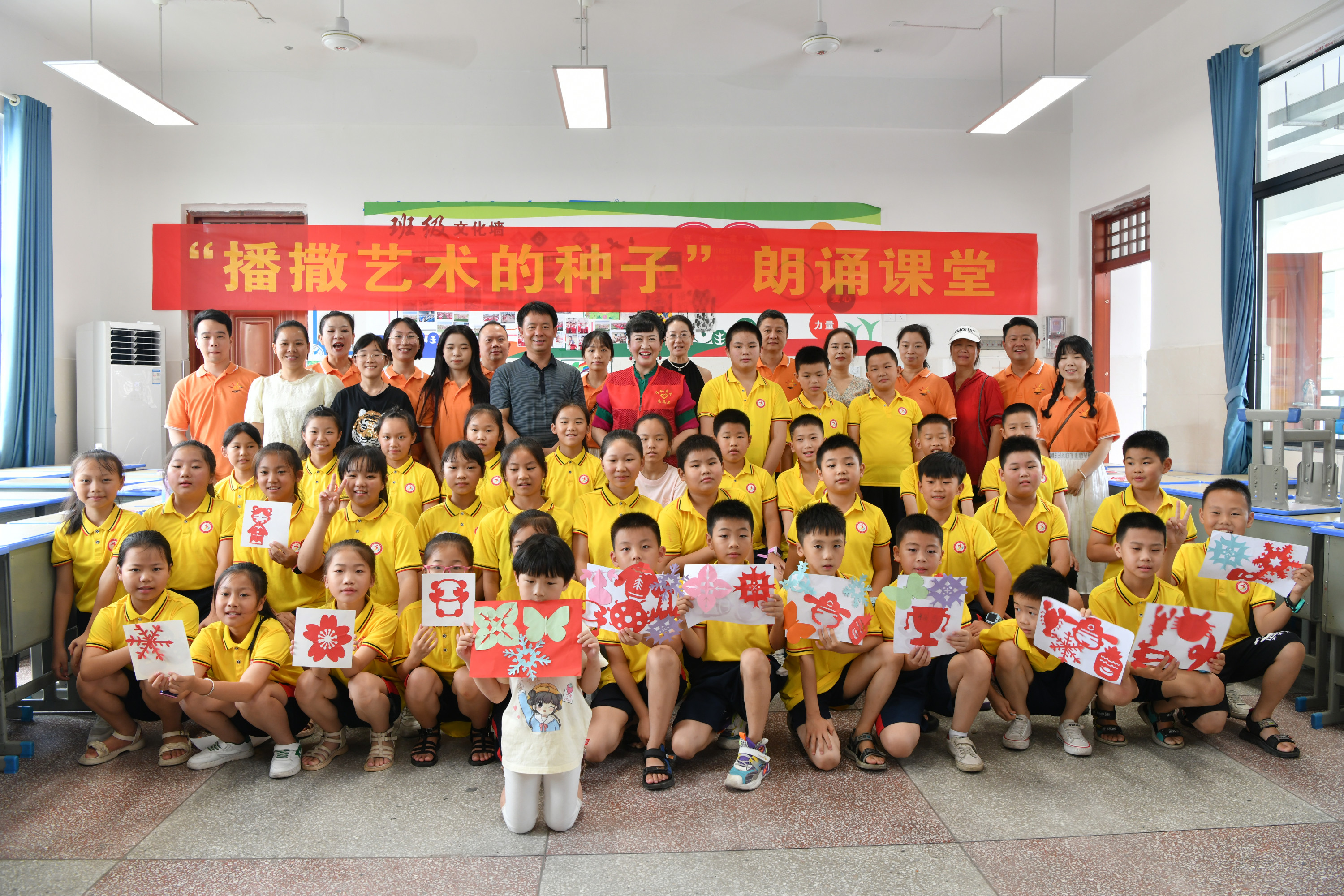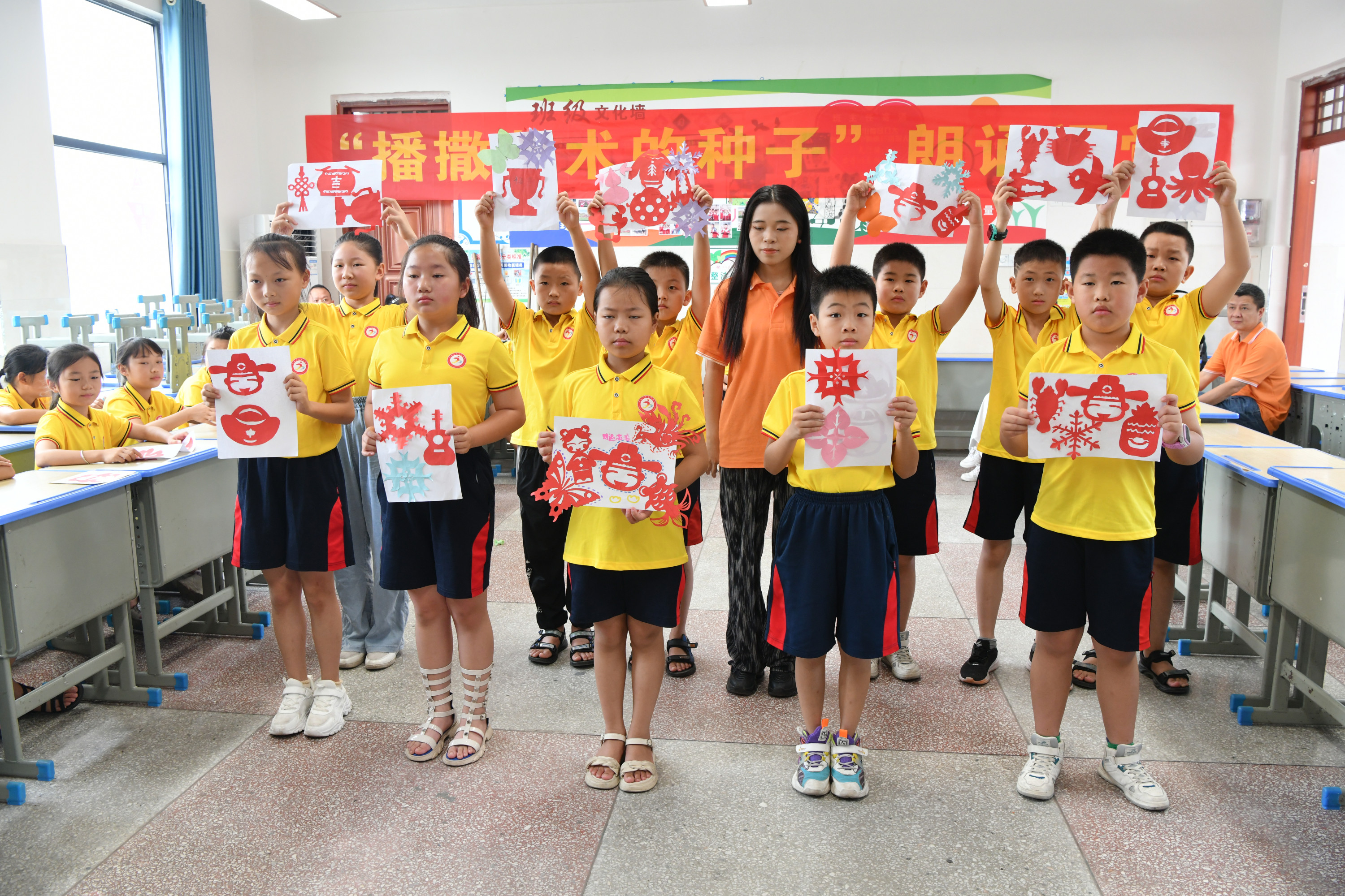 结业仪式上,43名孩子表演了诗朗诵《观沧海》和新化山歌《梅山童谣》。同时,孩子们还展示了自己的美术作品,特别是具有浓郁地方特色的剪纸作品让人眼前一亮。在课程开设上,采取综合教学的形式,既有新化山歌课,也有朗诵课,还有非遗项目——剪纸,让孩子们在学习中传承优秀民族文化。文化志愿者教师中,除了省市统筹安排老师外,还邀请了新化县优秀文化志愿者、新化山歌传承人陈福云老师授课,形式多样、丰富多彩。