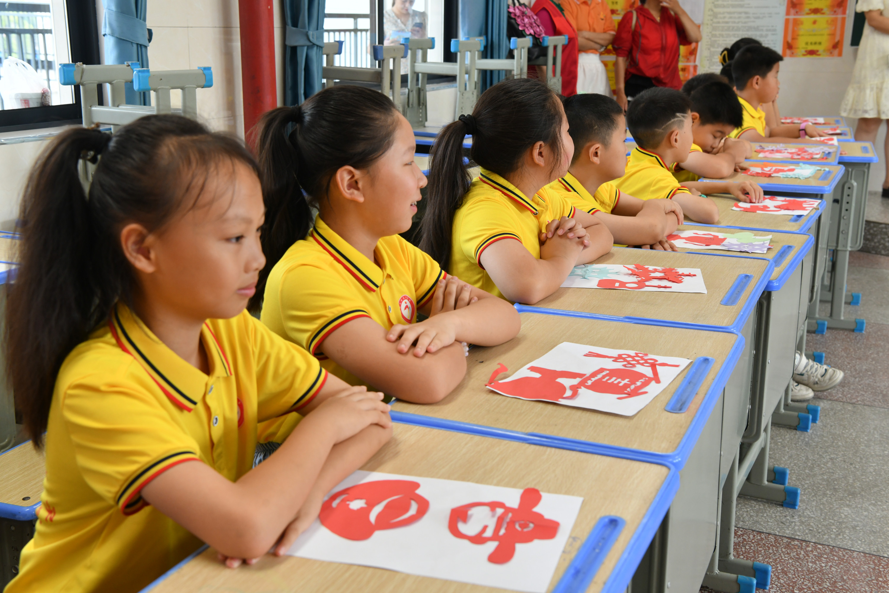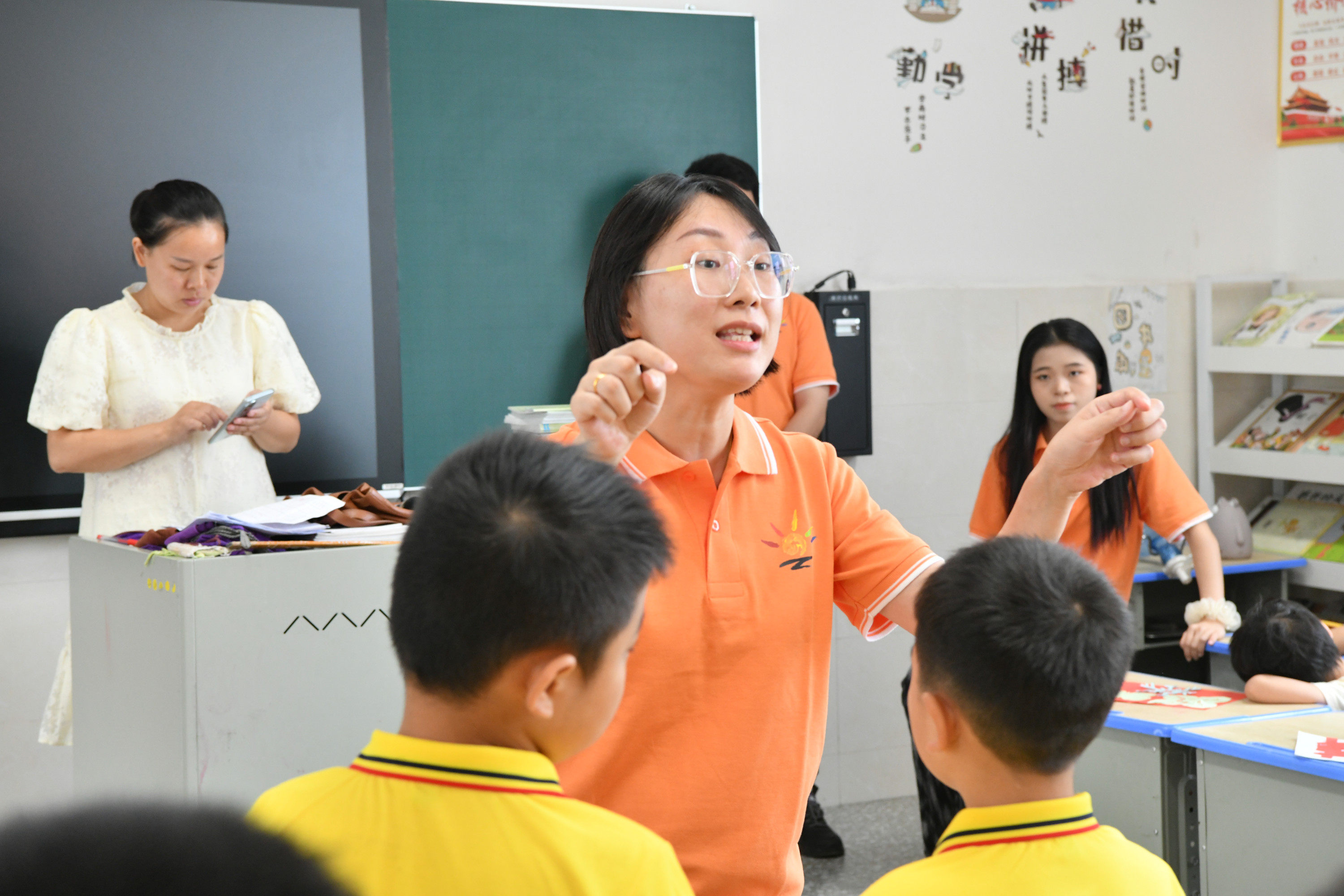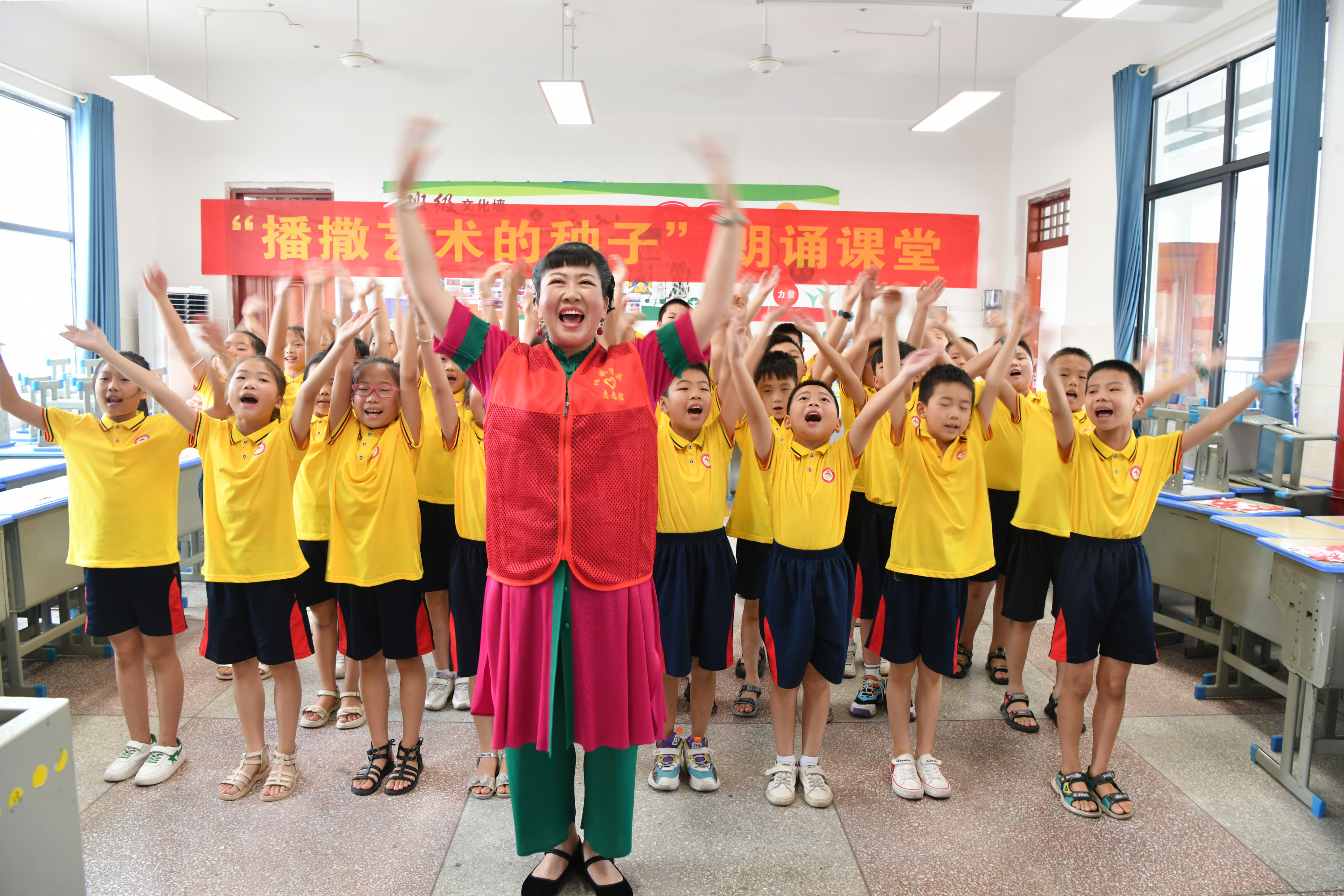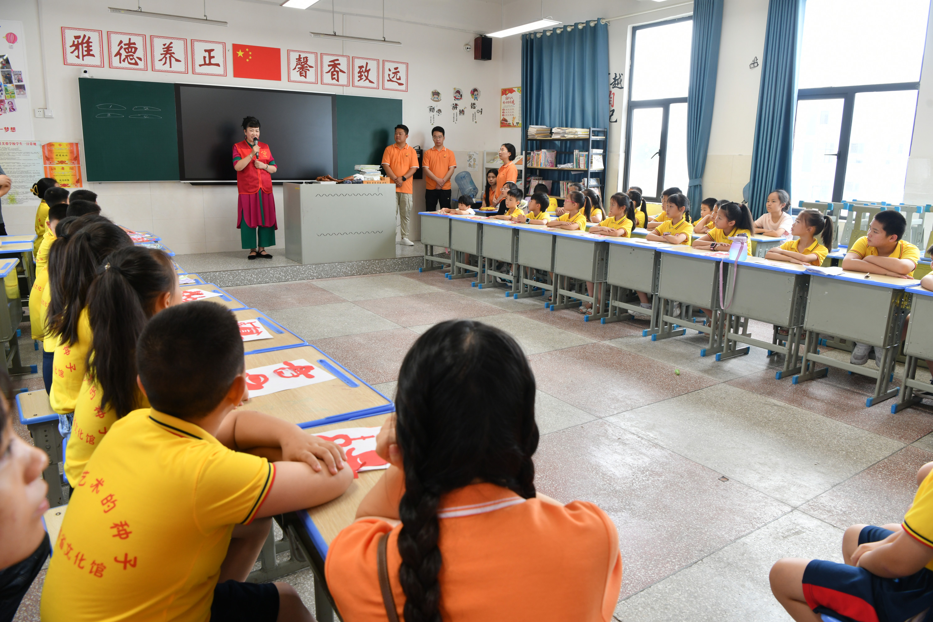 结业仪式上,43名孩子表演了诗朗诵《观沧海》和新化山歌《梅山童谣》。同时,孩子们还展示了自己的美术作品,特别是具有浓郁地方特色的剪纸作品让人眼前一亮。在课程开设上,采取综合教学的形式,既有新化山歌课,也有朗诵课,还有非遗项目——剪纸,让孩子们在学习中传承优秀民族文化。文化志愿者教师中,除了省市统筹安排老师外,还邀请了新化县优秀文化志愿者、新化山歌传承人陈福云老师授课,形式多样、丰富多彩。