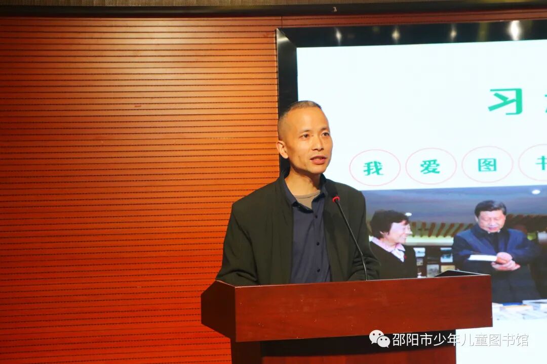 邵阳市少儿图书馆馆长周任飞介绍宣传周系列活动内容