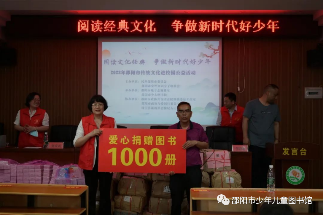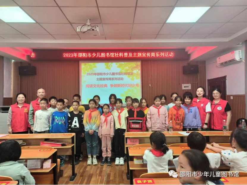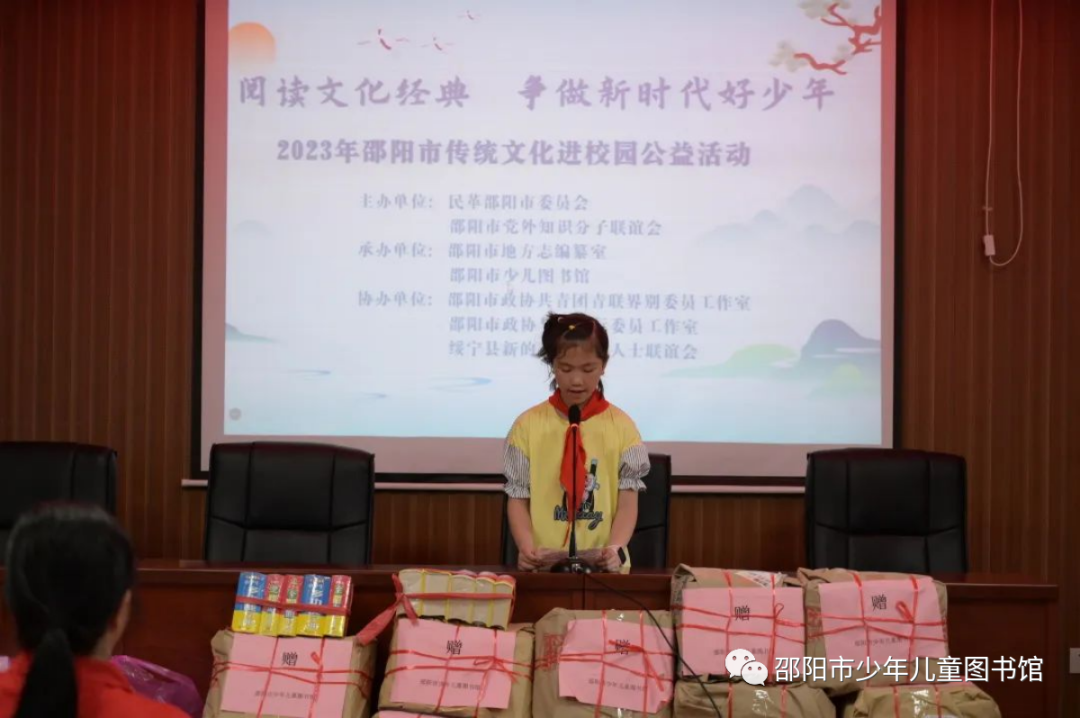 2023年5月25日,市少儿图书馆联合民革邵阳市委员会、市党外知识分子联谊会、市地方志编纂室、大祥区志愿者协会等多个单位举办“阅读文化经典,争做新时代好少年”传统文化进校园公益活动。此次活动由,旨在引导青少年儿童立足新时代,探源中华文明,传承和弘扬中华优秀传统文化和湖湘文化。