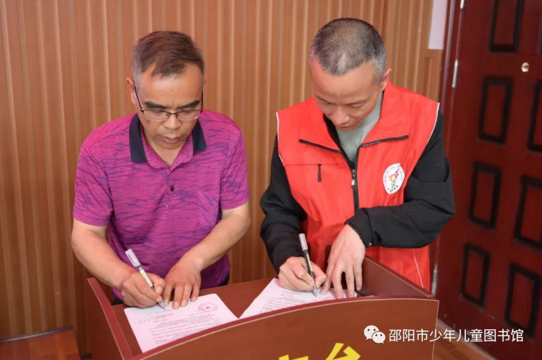 市少儿图书馆馆长周任飞和关峡苗族乡学校签订邵阳市少儿图书馆外流通服务点共建协议书。