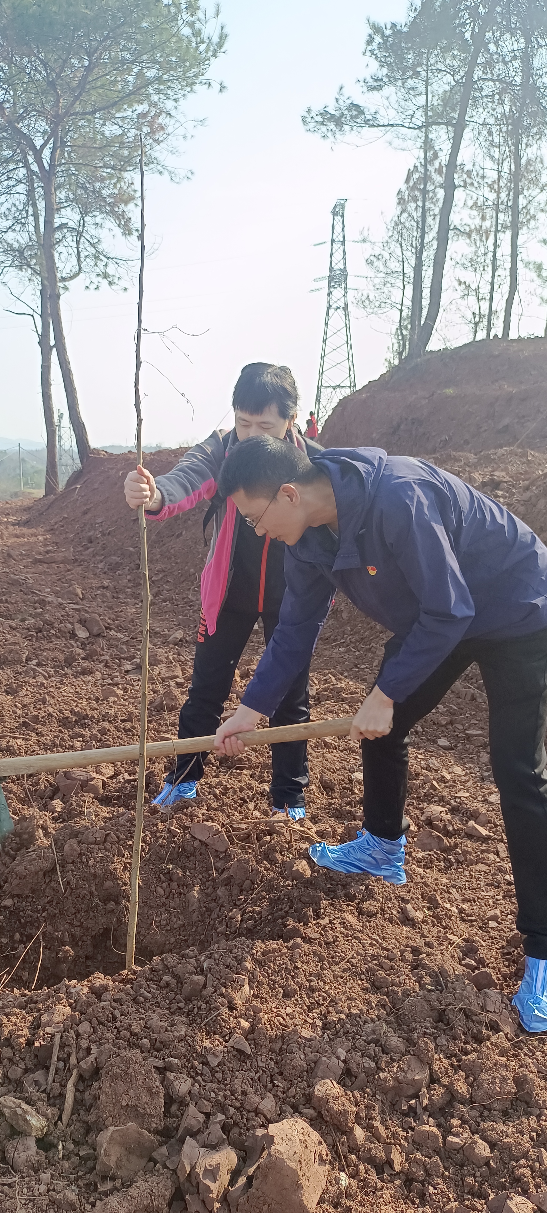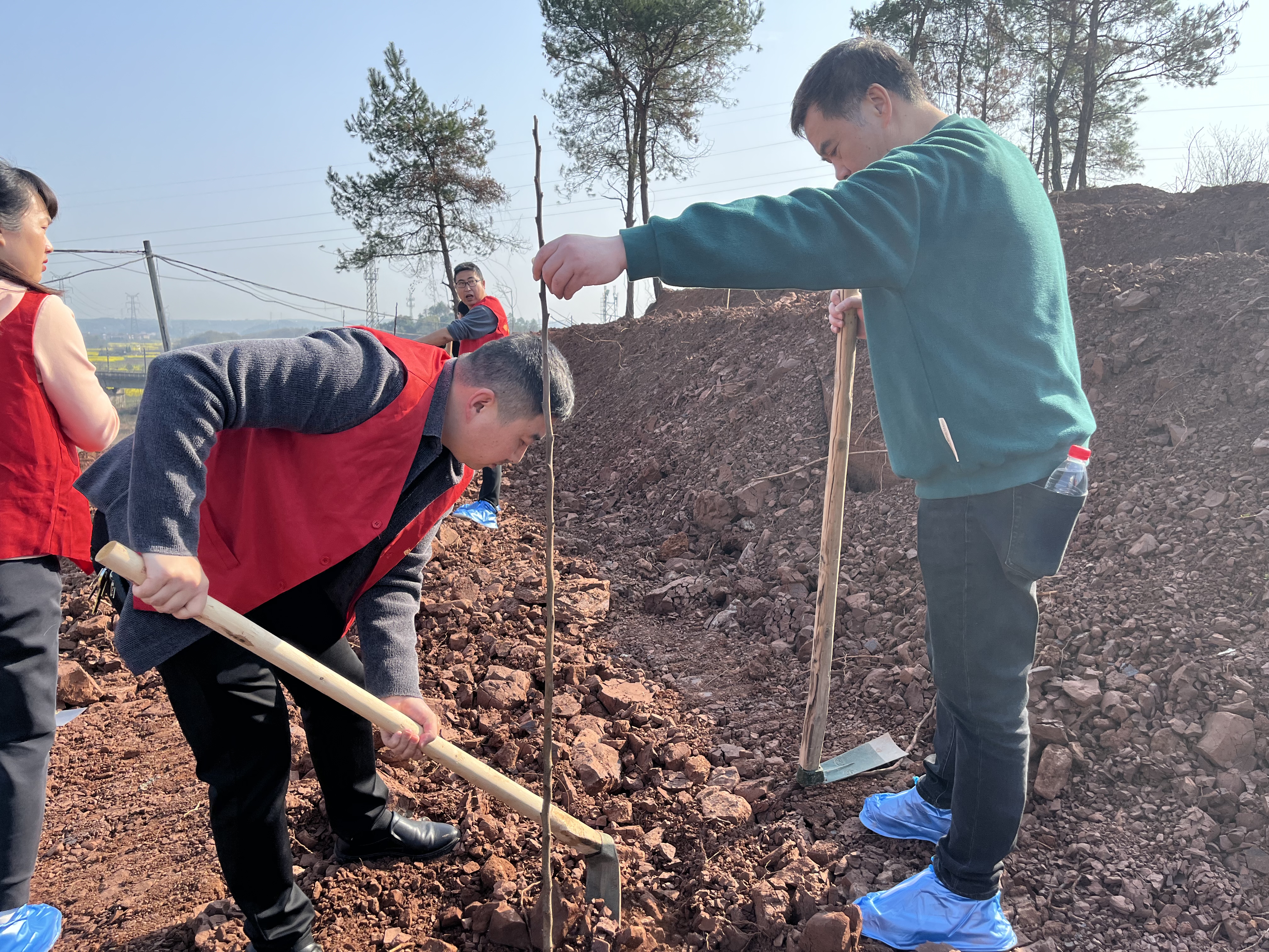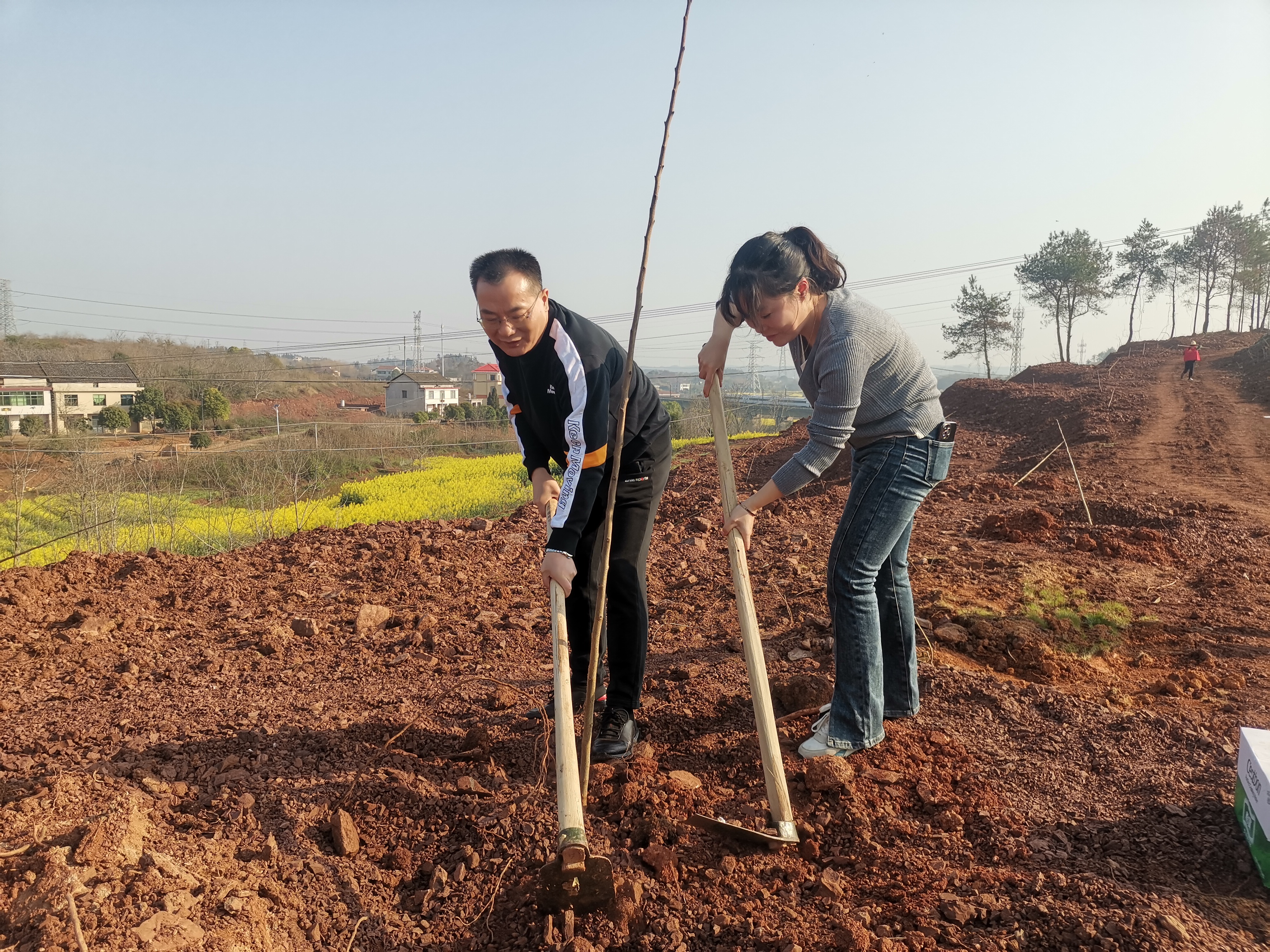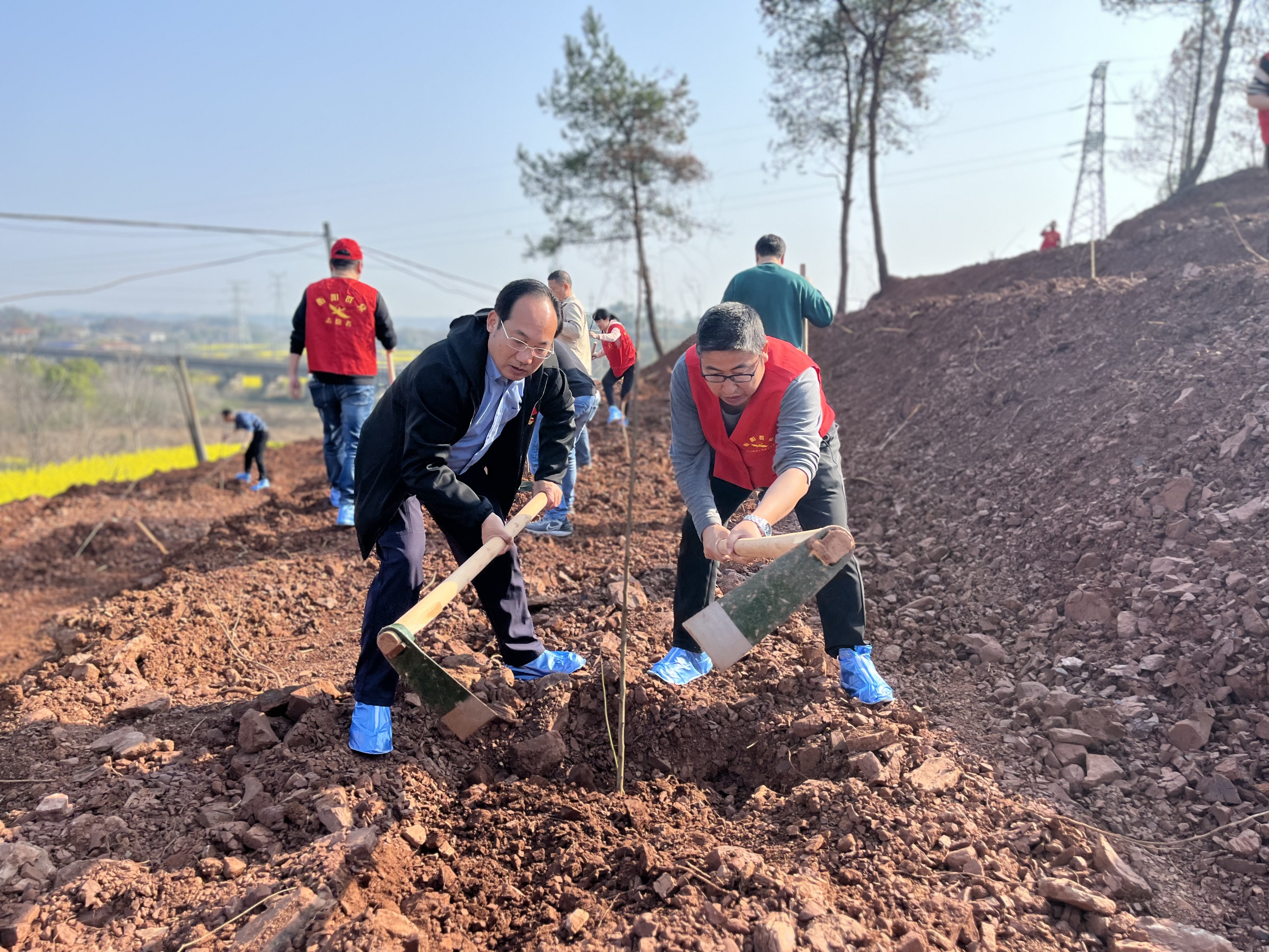 植树现场,衡阳市文旅广体局机关30余名党员在局党组书记、局长邹远国的带领下,认真细致培土,栽下了一颗颗土枇杷树。