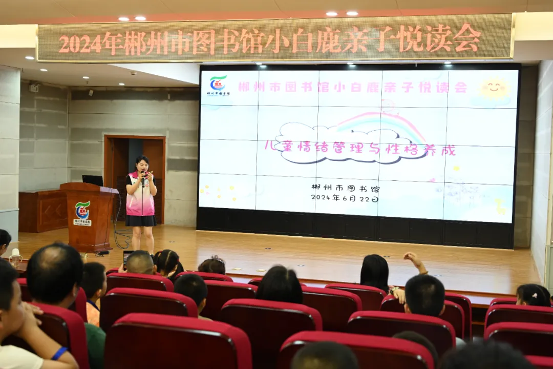2024年6月22至23日,小白鹿亲子悦读会“儿童情绪管理和性格养成”主题活动在市本馆、苏仙区图书馆会场、福地少儿馆、王仙小学露泉分馆举行,120组亲子家庭参加活动。
