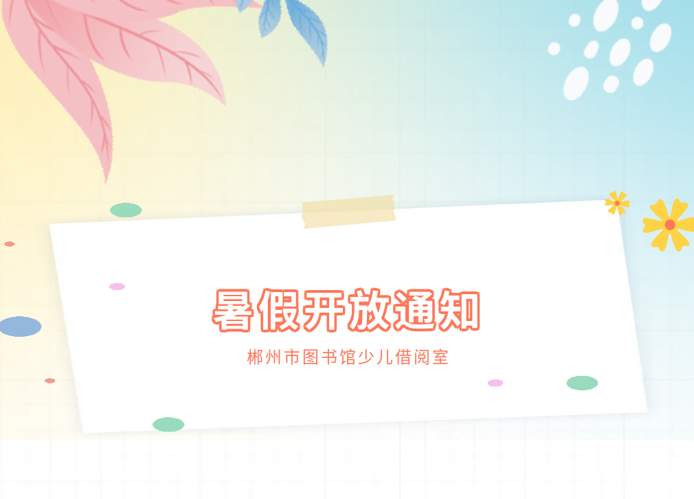 为满足暑假期间少儿读者借阅需求,郴州市图书馆少儿借阅室将于2024年7月6日至8月31日实行暑假开放时间。具体开放时间如下: