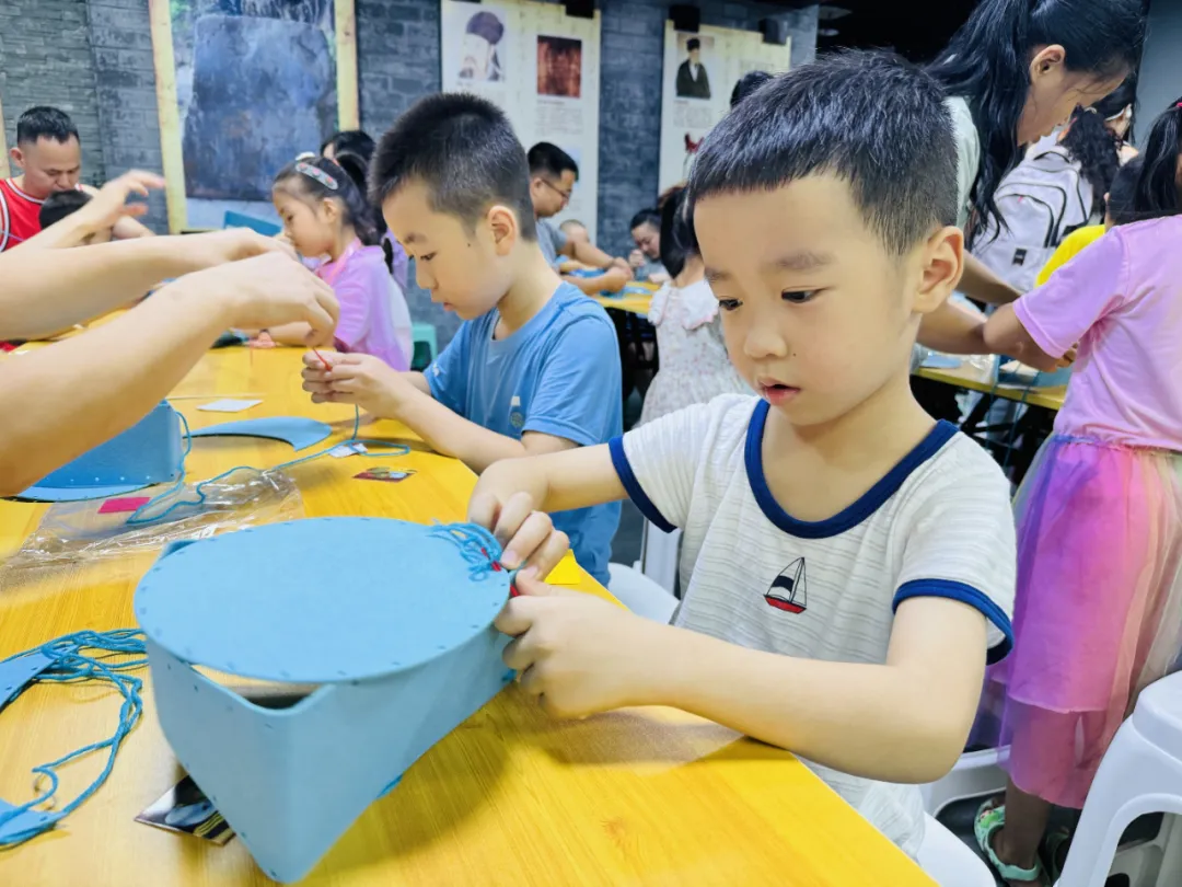 延伸活动,孩子们在父母和志愿者的陪伴下制作“红军帽”,对,就是“孩子王”秦三川和小伙伴为了乡亲们没能参加八路军戴上的那一顶。将帽子的各个部分取下,穿针引线将他们缝起来,再黏上闪闪发亮的五角星和麦穗,戴上它,一个个神飞气扬的“小红军”就出现了。