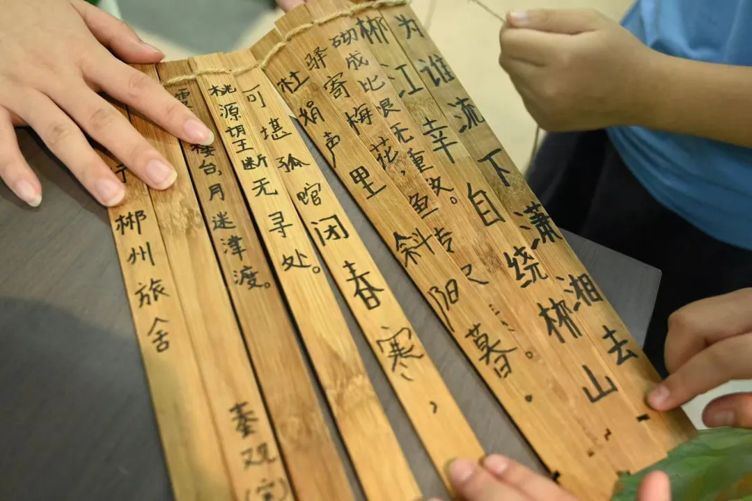 西晋简牍是博物馆的镇馆之宝,为2003年至2004年在郴州市苏仙桥一基建工地出土的文物,共有909枚,郴州晋简是目前国内发现最多、保存最好、最成系统的晋简,具有极高文献价值。参观时孩子们已经看到了一整面墙的壮观展示,为了让孩子们得到更好的体验感,锻炼动手能力,在研学教室我们准备了许多竹简,让孩子们自己动动小手,分工合作,合力编写出一本《踏莎行·郴州旅舍》竹简,“郴江幸自绕郴山,为谁流下潇湘去”,古文化与地方文化的结合,让孩子们收获满满。