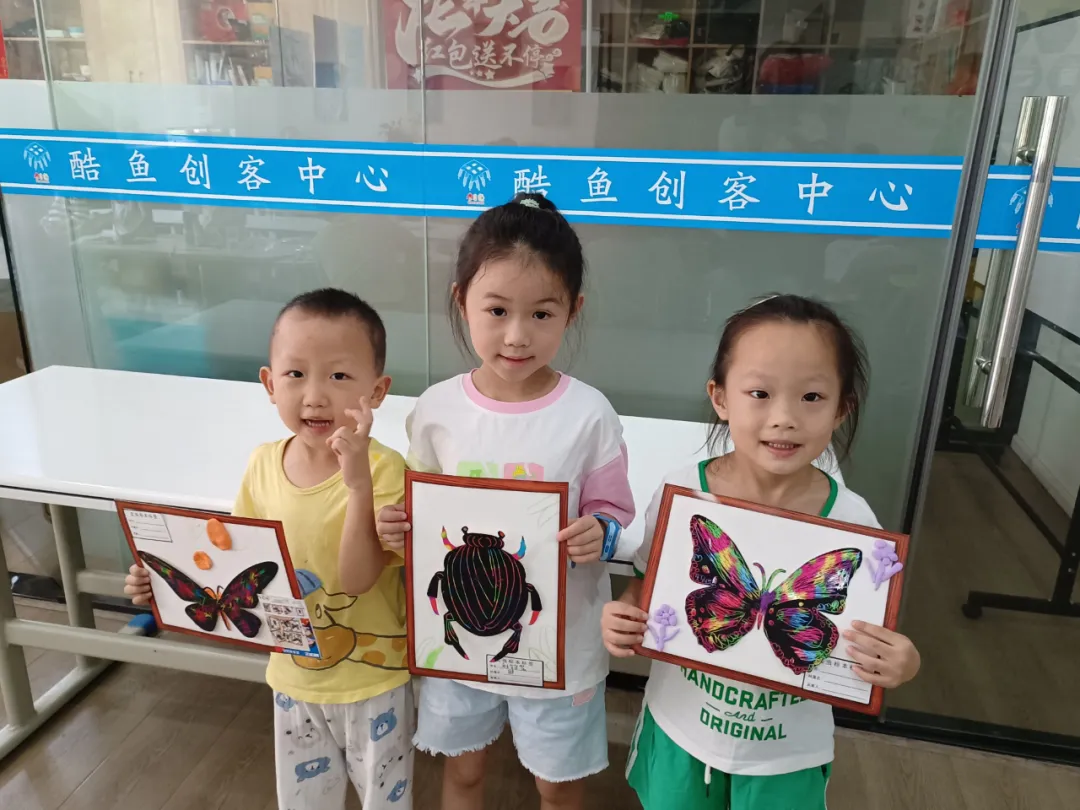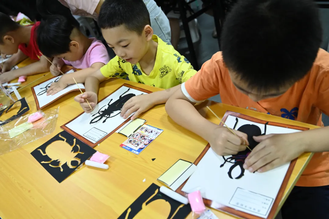 延伸活动,孩子们在父母和志愿者的陪伴下制作“昆虫刮刮画”。选择自己喜欢的昆虫用刮笔刮掉黑色的表层,顿时五彩斑斓、栩栩如生,再配以底板和相应的装饰,我们的作品就完成了。