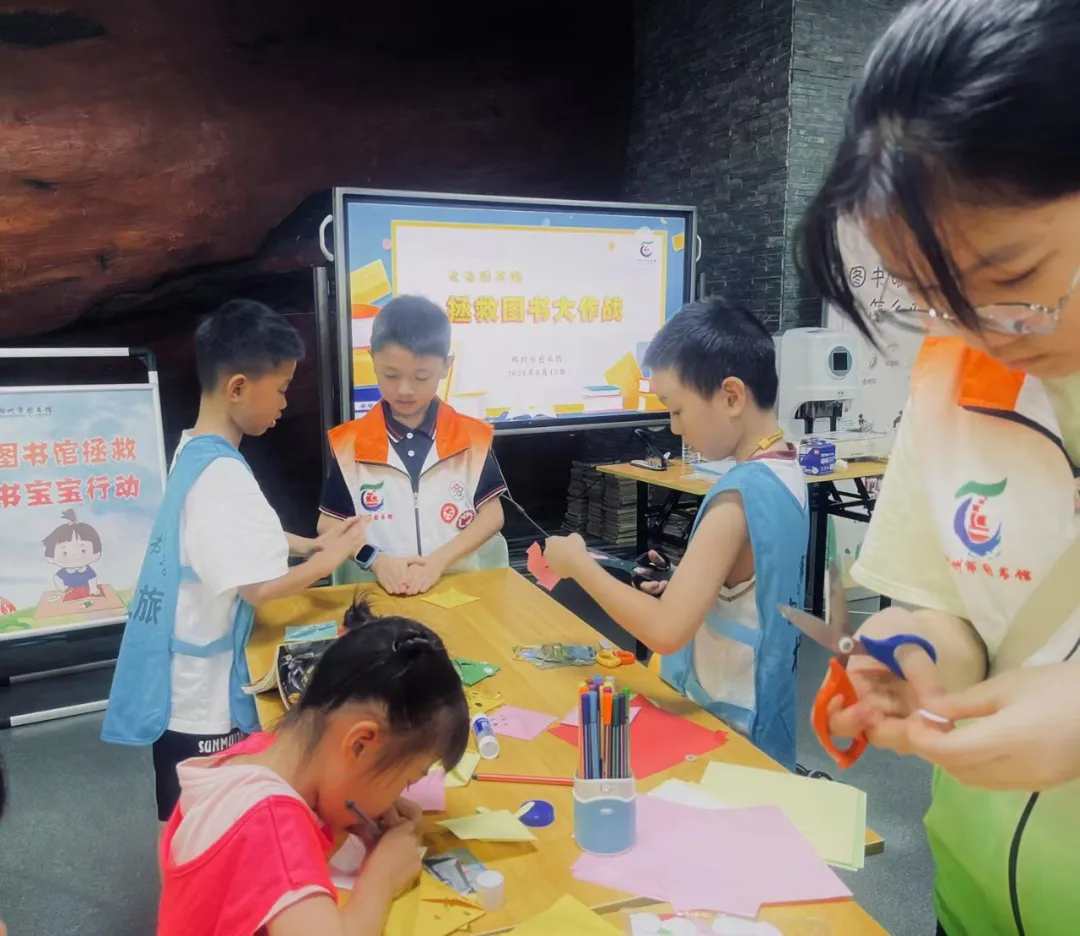 随后,孩子们摇身一变,成为了勇敢的“图书小卫士”,全身心地投入到修补破损图书的行动当中。他们先是仔细检查图书的破损状况,然后精心准备修补工具。在修补进程中,他们小心翼翼地粘贴书页、加固书脊,让每一本受损的图书都重焕生机。而体验装订机装订图书的环节更是充满新奇感,在图书馆志愿者钟姗老师的悉心指导下,孩子们亲手操作机器,将脱落的零散书页再度整合为一本完整的书,那份满满的成就感简直无法言喻。