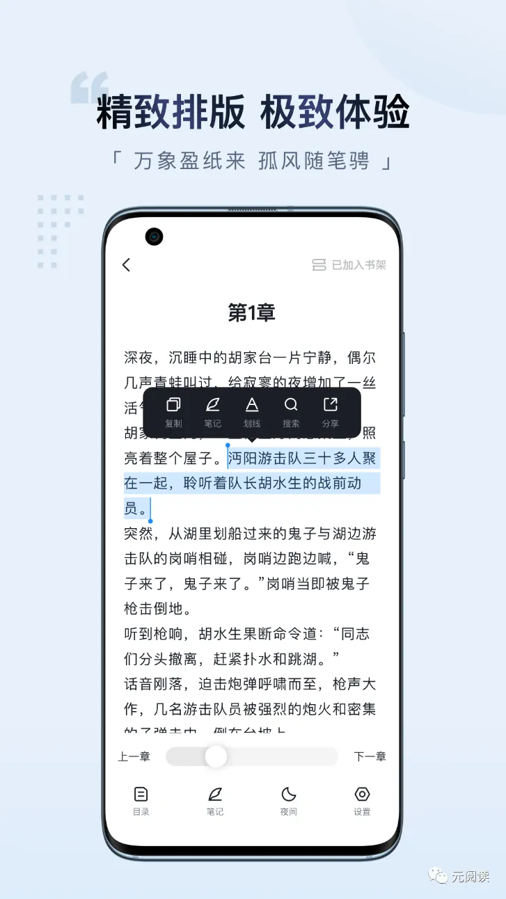 设计简洁,排版精良,EPUB精排版资源提供优质的阅读体验,支持在阅读中添加划线、批注、书签,还可以随心个性化您的主题风格、阅读排版、背景、翻页方式等专属阅读风格。