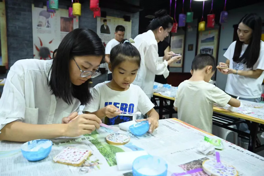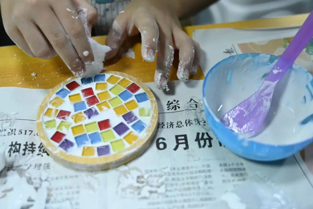 延伸活动,志愿者和家长带着孩子们一起制作马赛克杯垫,在竹质杯垫底座上,涂上白色胶水,再将五颜六色、形状各异的马赛克颗粒点缀其间,铺上调和好的美缝剂,用清洁海绵清理并晾干,一个个温馨简约的创意杯垫就做好了。