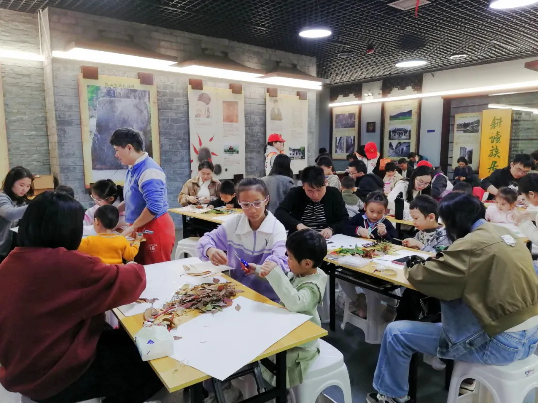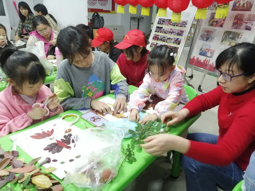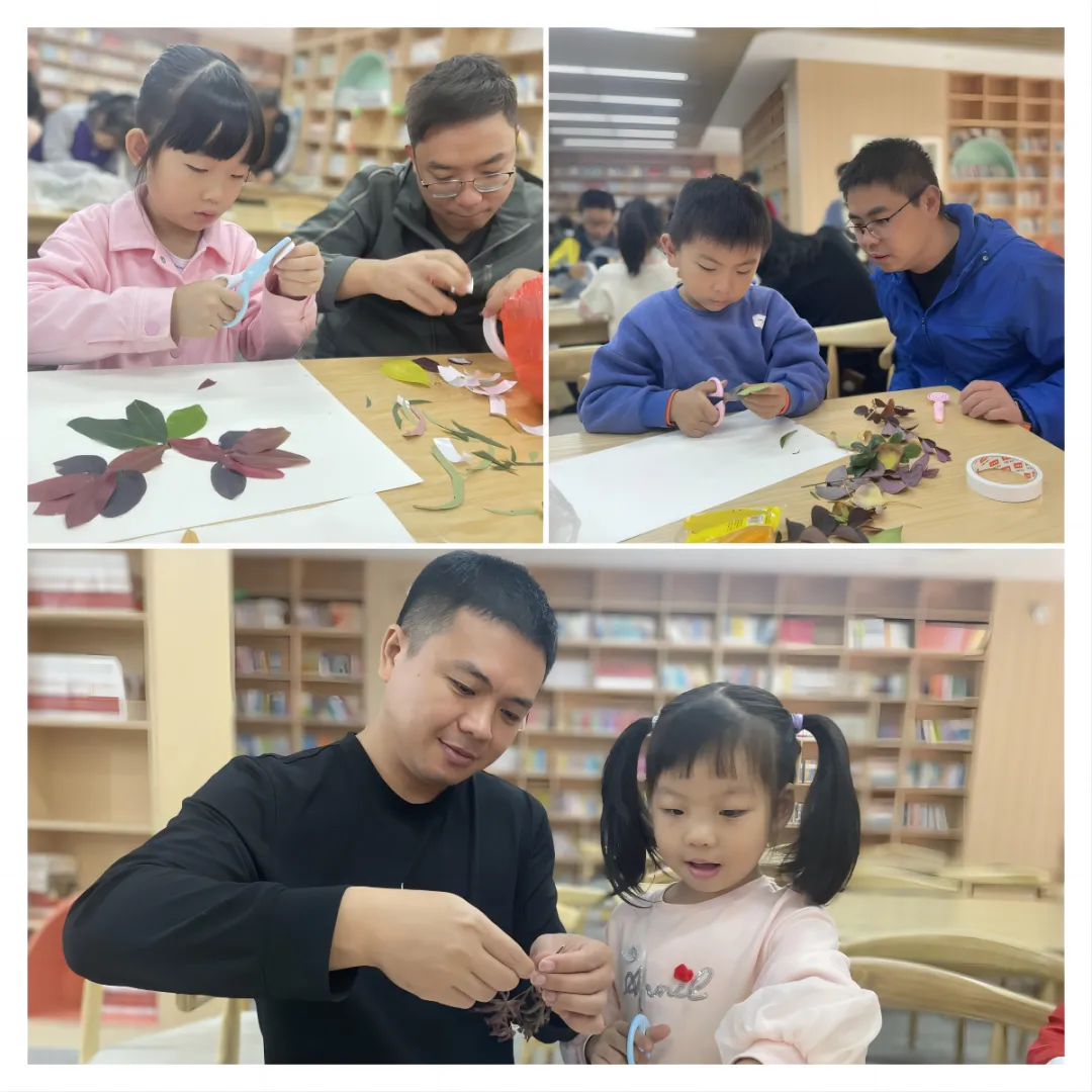 延伸活动,志愿者和家长带着孩子们一起制作树叶画,提前采集好深秋的落叶,一刀刀将叶子剪成需要的形状,将其黏贴在构思好的底稿上,一只只色彩斑斓、吉祥美好的凤凰从纸面上跃然而出。
