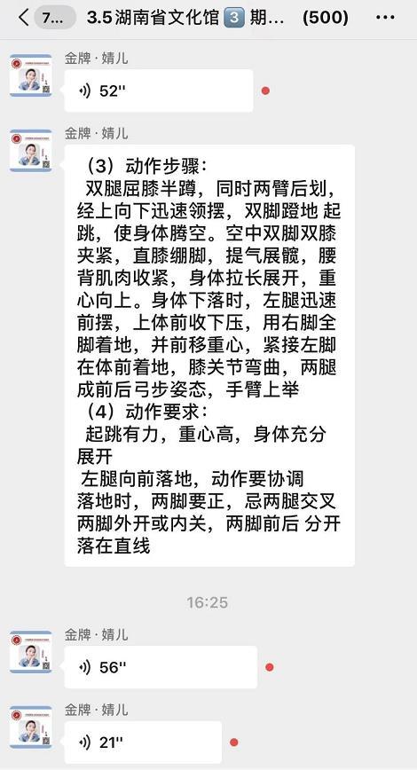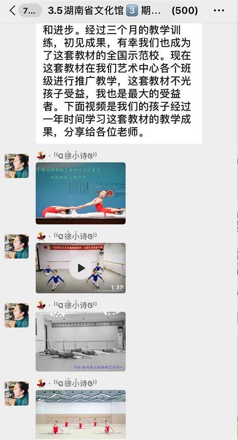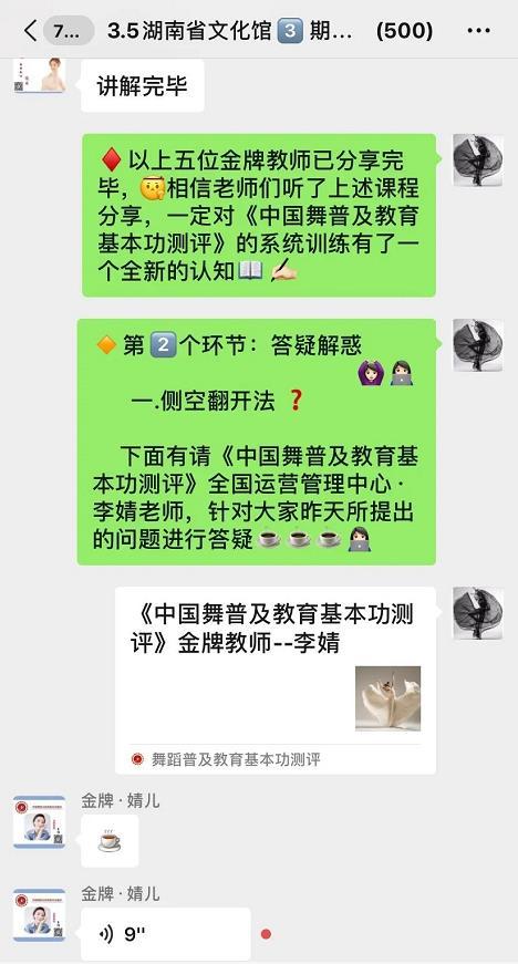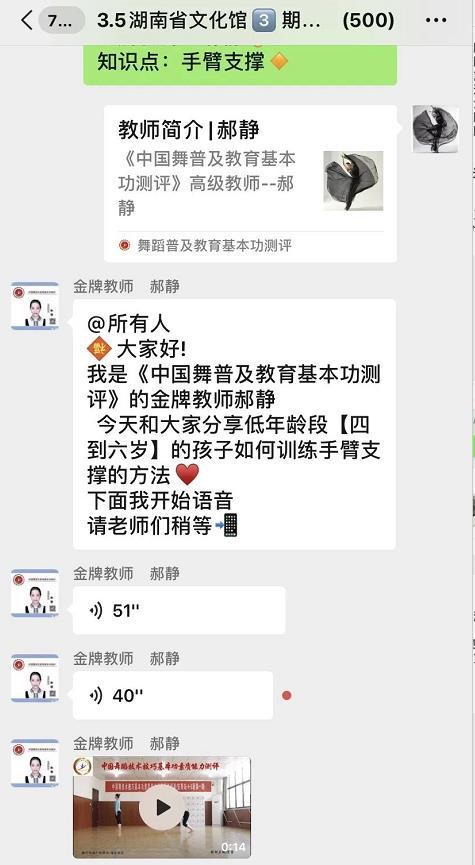 3月1日和3月5日 由湖南省文化馆主办第3、4、5期舞蹈微课堂《中国舞普及教育基本功测评》《健康养生舞》《天使芭蕾》艺苑课堂系列课程之公益微课堂顺利结课,课程吸引了上万湖南省艺术爱好者的踊跃报名,报名海选群实时急速增长,由于微信群名额有限最终经审核参加微课堂培训的人数为2500人,课程内容新颖,亮点突出,感动颇多。为社会不同年龄段的舞蹈爱好者提供免费学习的平台,让大家在全国疫情时期,宅在家里也能提升艺术修养。