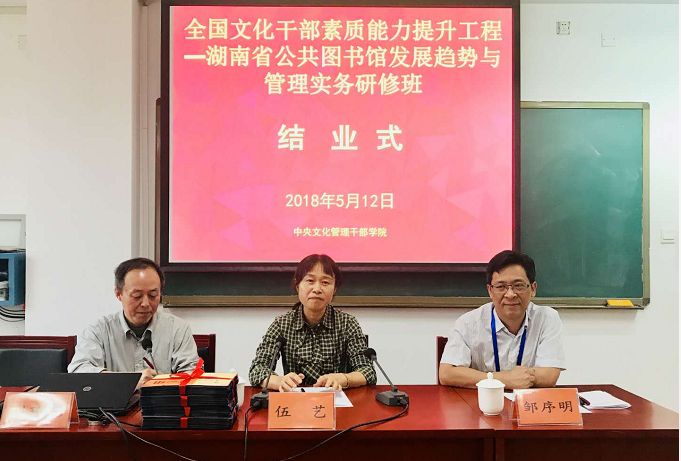5月12日,在京举办的为期11天的湖南省公共图书馆发展趋势与管理实务研修班,画上圆满句号。湖南图书馆党委书记伍艺、中央文干院文化事业培训部主任刘瑞彪、湖南图书馆副馆长邹序明出席结业式并分别讲话。