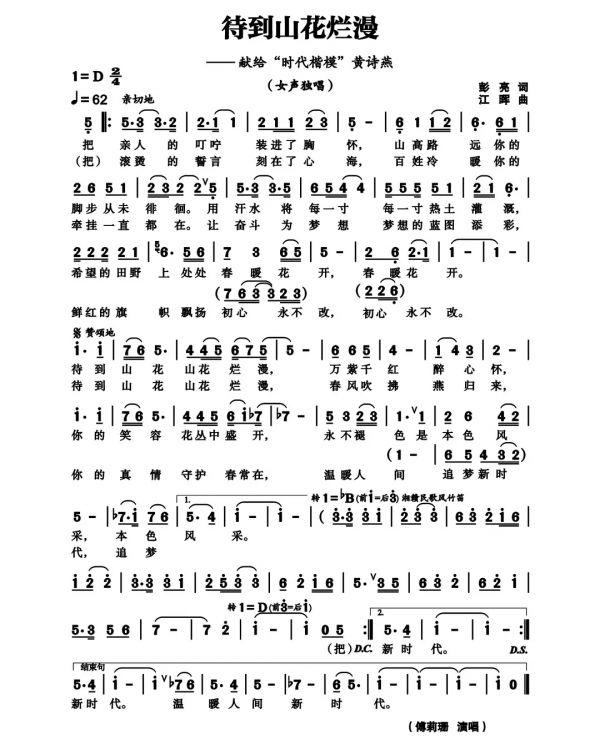 《待到山花烂漫》曲调优美婉转,歌词贴切传神。由中央民族乐团独唱演员、株洲籍青年歌唱家傅莉珊深情录唱。“歌曲既有对黄诗燕的追忆怀念,又有对扶贫工作者的歌颂赞扬,整首歌曲传递着春天般的温暖,充满了正能量。”市民王先生听后说。