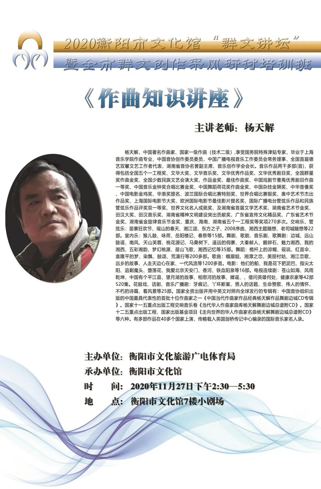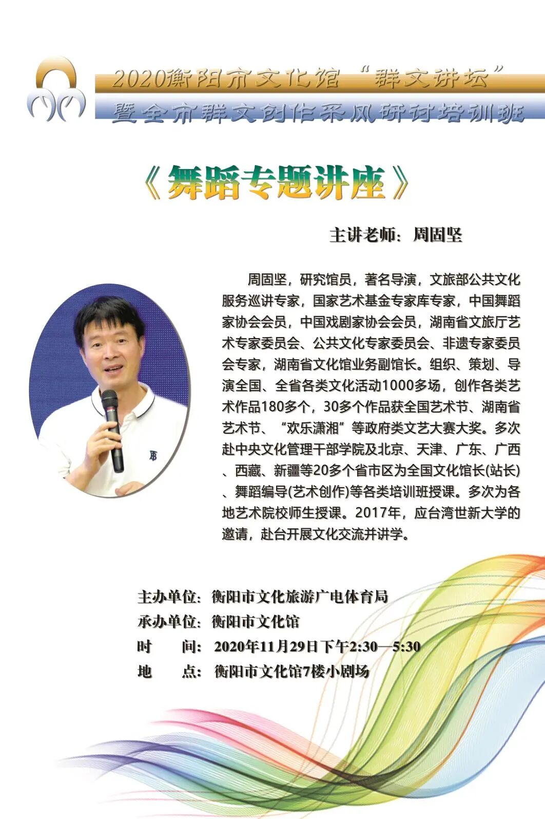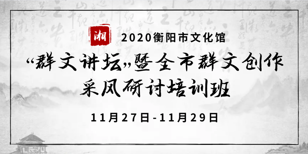 为学习贯彻习近平总书记关于文艺工作重要论述精神,全面提升衡阳市艺术工作者思想政治素质和业务素养,努力建设一支爱国、为民、崇德、尚艺的优秀文艺队伍,促进衡阳市群文艺术创作的繁荣发展,11月27日至29日,2020衡阳市文化馆“群文讲坛”暨全市群文创作采风研讨培训班即将开讲。