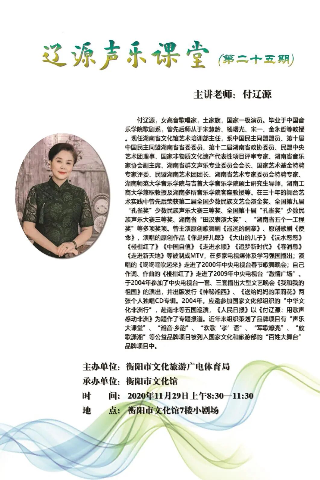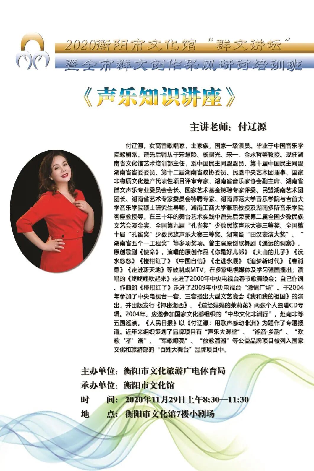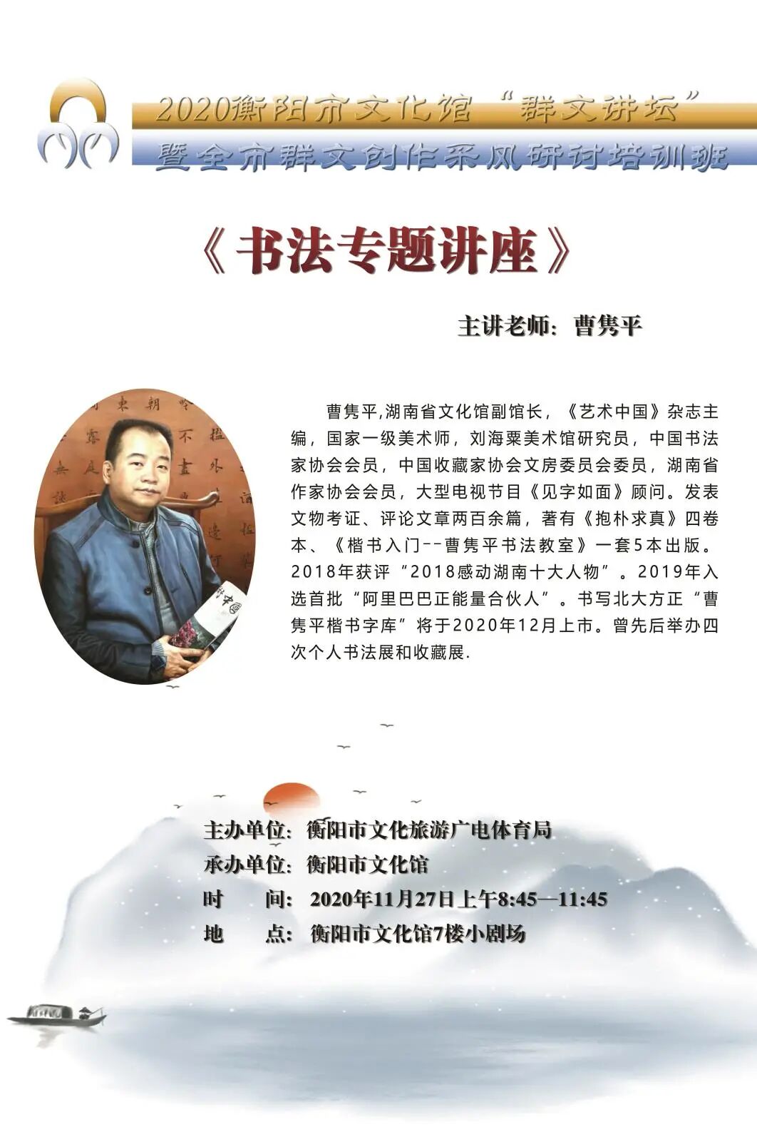 为学习贯彻习近平总书记关于文艺工作重要论述精神,全面提升衡阳市艺术工作者思想政治素质和业务素养,努力建设一支爱国、为民、崇德、尚艺的优秀文艺队伍,促进衡阳市群文艺术创作的繁荣发展,11月27日至29日,2020衡阳市文化馆“群文讲坛”暨全市群文创作采风研讨培训班即将开讲。
